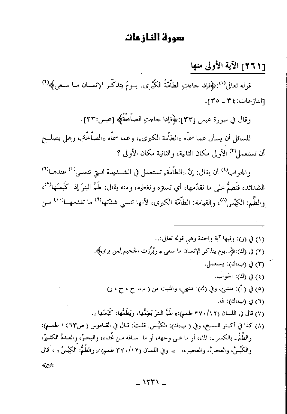 الجواب أن يقال: إن الطاّمة تستعمل في الشديدة التى تنسى عندها الشدائد، فتَطم على ما تقدّمها، أىِ تستره وتغطيه، ومنه يقال: طَم البئرَ إذا كَبَسَها، والطِّم: الكبْس، والقيامة: الطاّمّة الكبرى، لأنها تنسى شدّتها ما تقدم من
