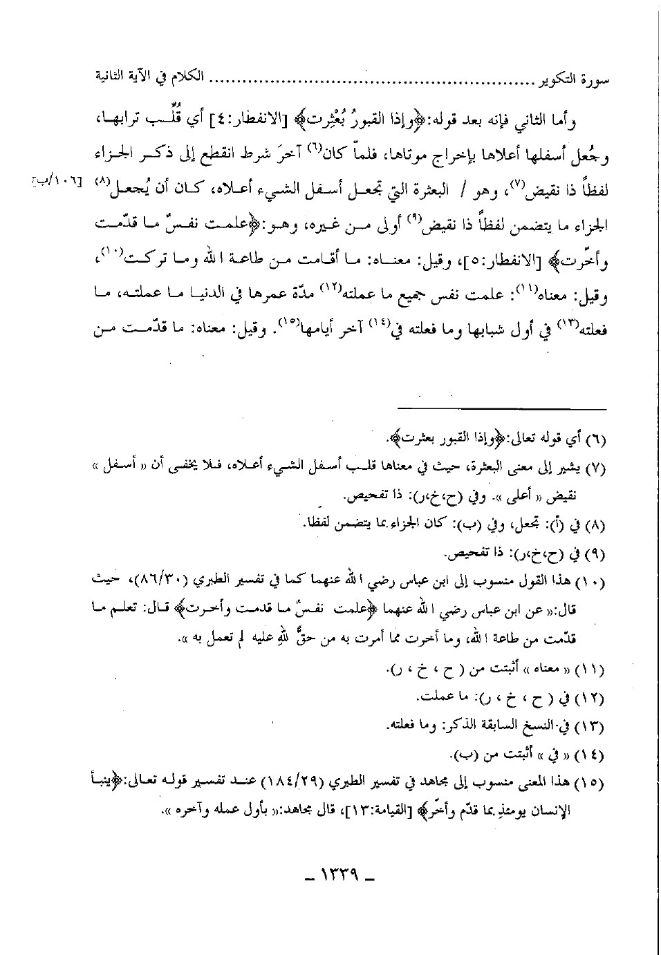 وأما الثاني فإنه بعد قوله: (وإذا القبور بُعْثِرت) أي: قُلِّب ترابها، وجعل أسفلها أعلاها بإخراج موتاها، فلماّ كان آخرَ شرط انقطع إلى ذكر الجزاء