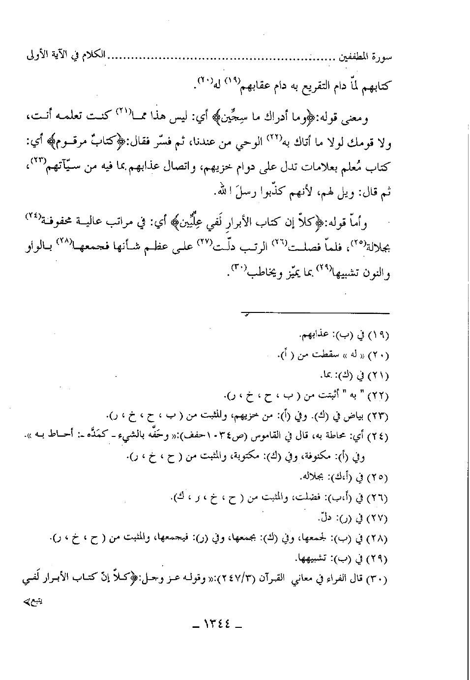 وأماّ قوله: (كلاّ إن كتاب الأبرارِ لَفي عِليين) أي: في مراتب عالية مكنوفة بجلالة فلما فضلت الرتب دلّت على عظم شأنها بجمعها بالواو والنون تشبيها بما يميّز ويخاطب.