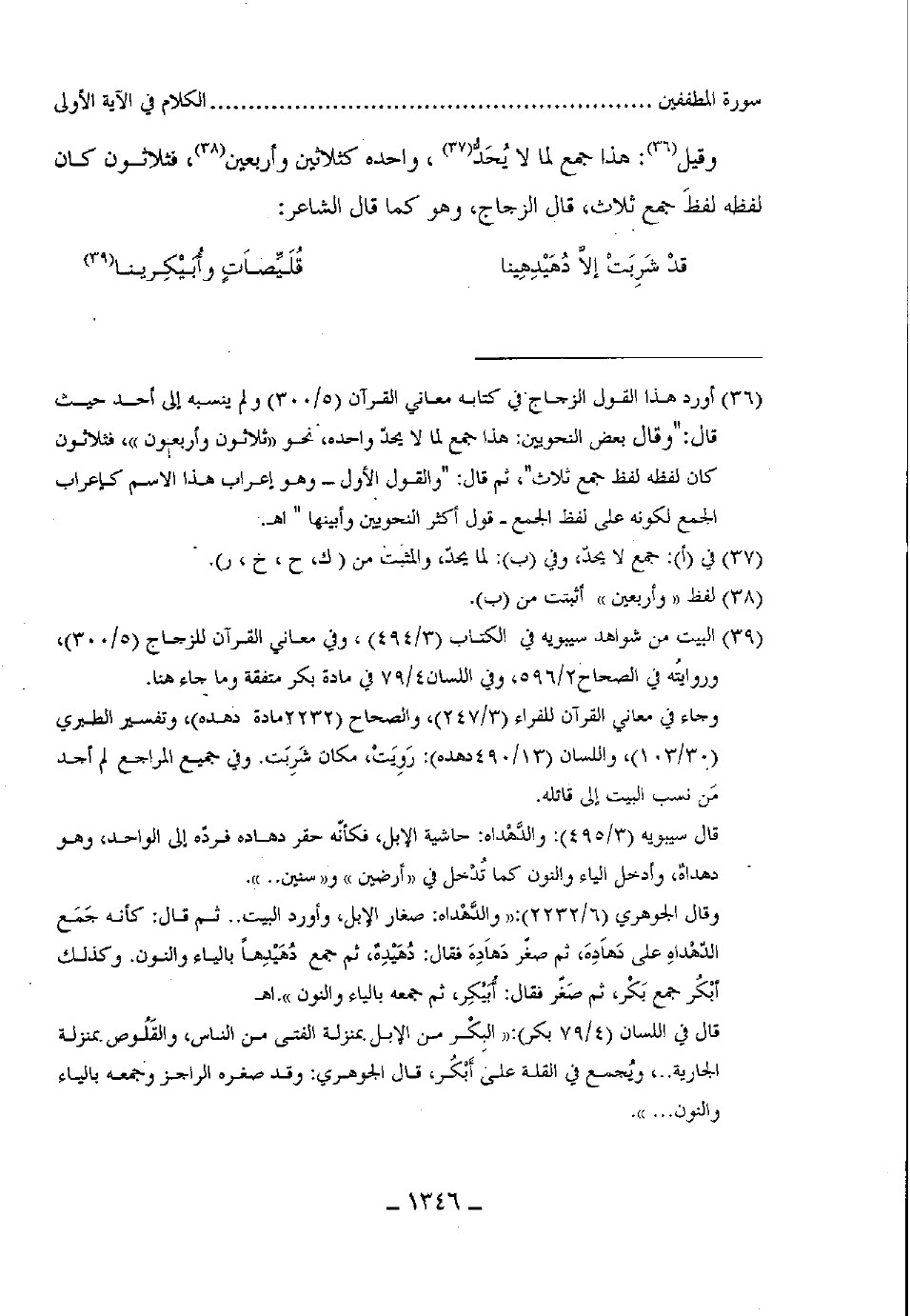وقيل: هذا جمع لما لا يُحَدُّ، واحده كثلاثين وأربعين، فثلاثون كأن لفظه لفظَ جمع ثلاث،
