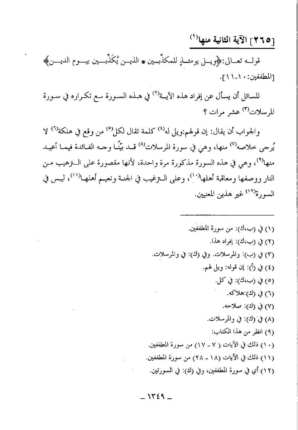 والجواب أن يقال: إن قوله: ويل لهم كلمة تقال في كلْ من وقع في هلكة لا يُرجى خلاصه منها، وهى في سورة المرسلات قد بيّنّا وجه الفائدة فيما أعيد منها، وهي في هذه السورة مذكورة مرة واحدة، لأنها مقصورة على الترهيب من النار ووصفها ومعاقبة أهلها، وعلى الترغيب في الجنة ونعيم أهلها، ليس في السورة غير هذين المعنيين.