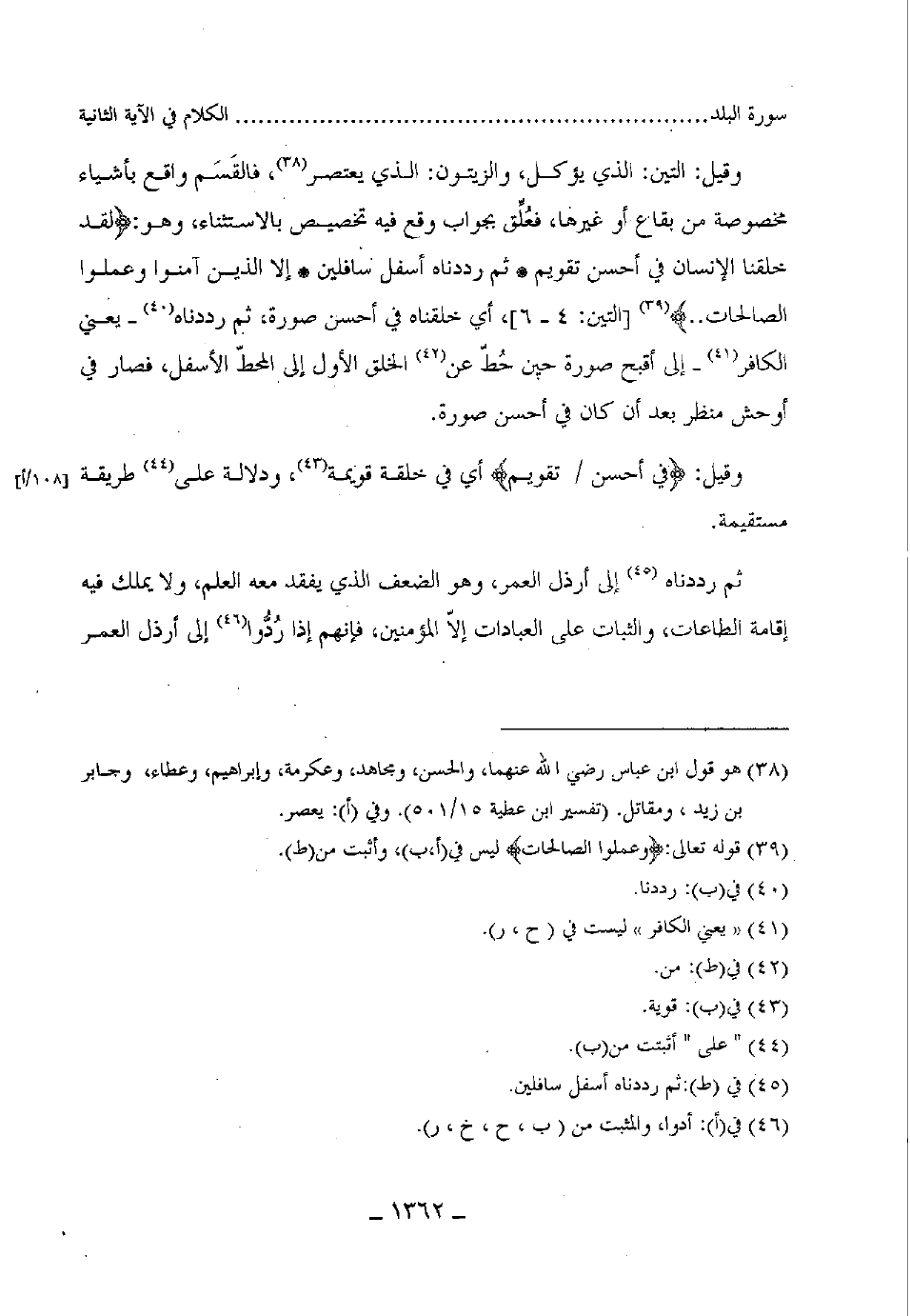 وقيل: التين: الذي يؤكل، والزيتون: الذي يعصر، فالقَسَم واقع بأشياء مخصوصة من بقاع أو غيرها، فعُلِّق بجواب وقع فيه تخصيص بالاستثناء، وهو: (لقد خلقنا الإنسان في أحسن تقويم ثم رددناه أسفلْ سافلين إلا الذين آمنوا وعملوا الصالحات..) ، أي خلقناه في أحسن صورة ثم رددناه - يعني الكافر - إلى أقبح صورة حين حطّ عن الخلق الأول إلى المحطّ الأسفل، فصار في أوحش منظر بعد أن كان في أحسن صورة.