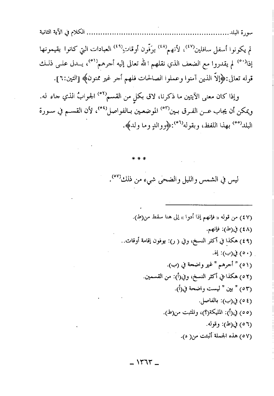 وإذا كان معنى الآيتين ما ذكرنا، لاق بكل من القسمين الجوابُ الذي جاء له. ويمكن أن يجاب عن الفرق بين الموضعين بالفواصل، لأن القسم في سورة البلد بهذا اللفظ، وهو قوله: (ووالدٍ وما ولد) .