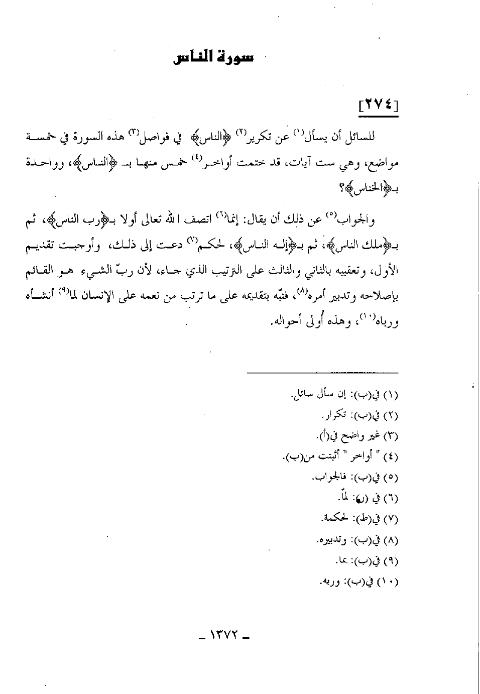 والجواب عن ذلك " أن يقال: إنما اتصف الله تعالى أولا برب الناس، ثم ب (ملك الناس، ثم بإله الناس، لحكمة دعت إلى ذلك، وأوحبت تقديم الأول وتعقيبه بالثاني والثالث على الترتيب الذي جاء، لأن ربّ الشيء هو القائم بإصلاحه وتدبير أمره فنبّه بتقديمه على ما ترتب من نعمه على الإنسان لما أنشأه ورباه، وهذه أولى أحواله.