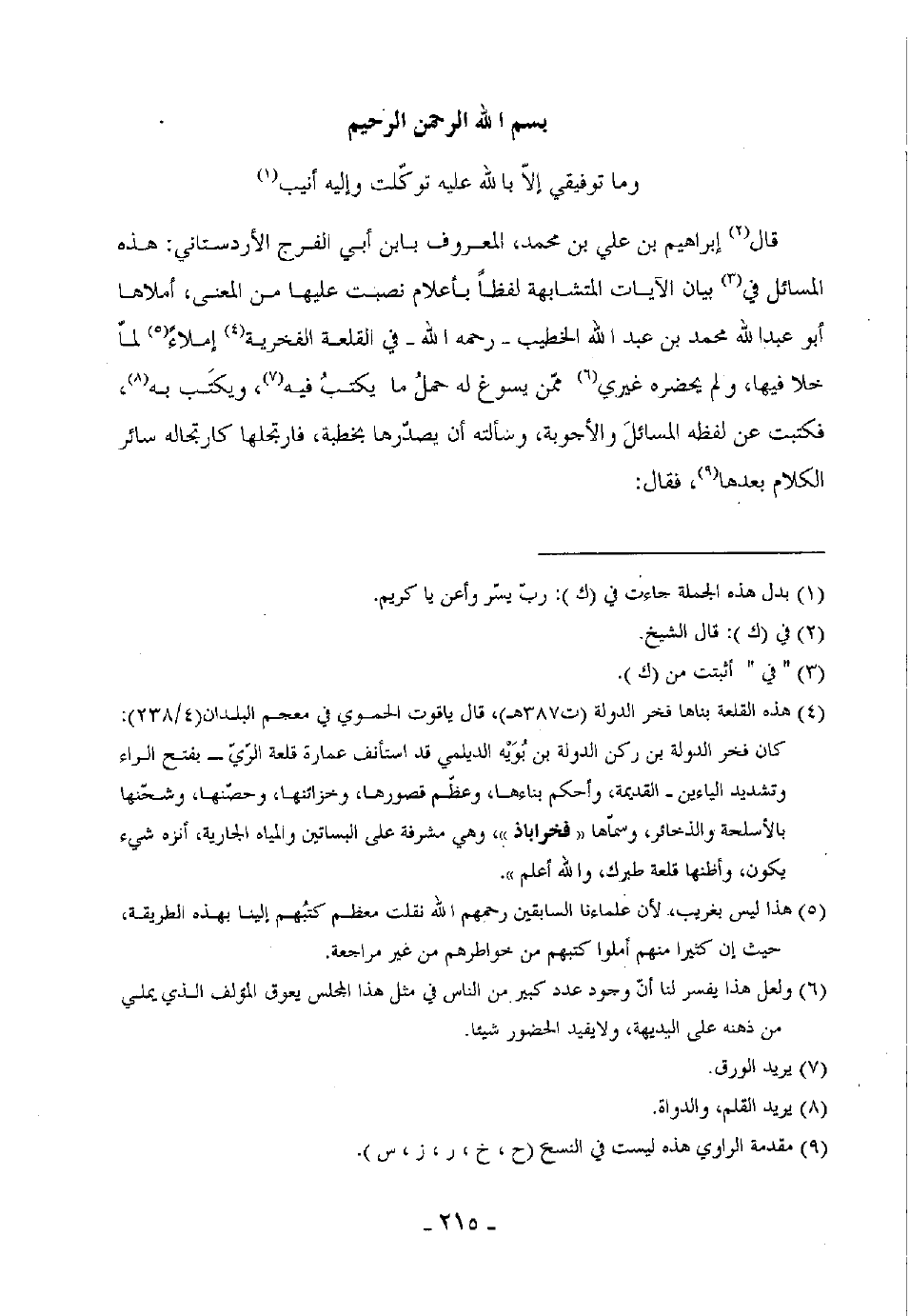 ما يكتب فيه، ويكتب به، فكتبت عن لفظه المسائل والأجوبة، وسألته أن يصدرها بخطبة، فارتجالها كارتجاله سائر الكلام بعدها، فقال: