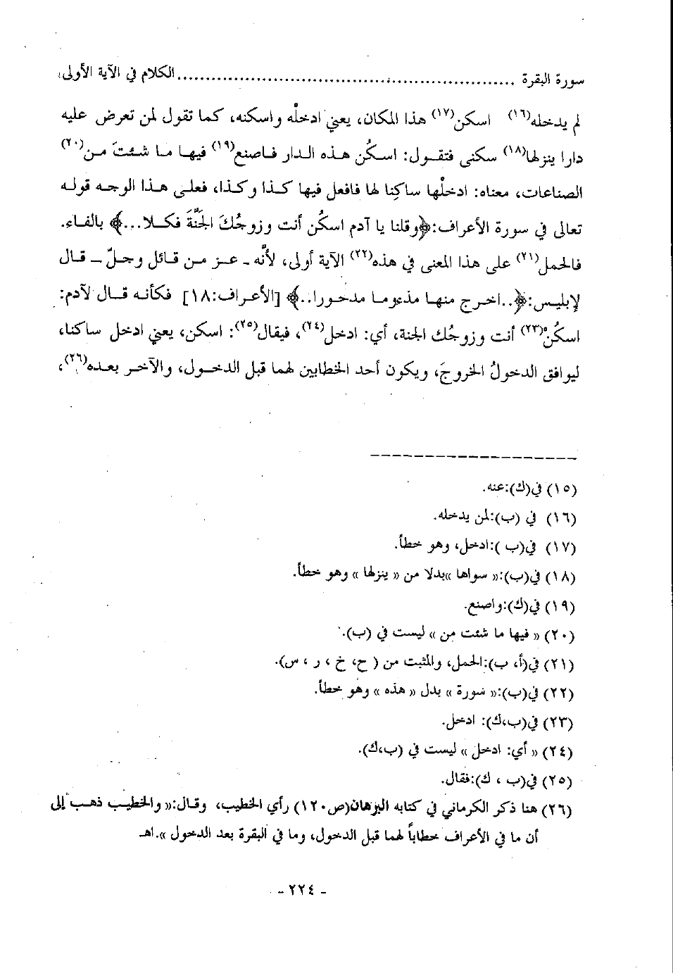 لم يدخله اسكن هذا المكان، عني ادخله واسكنه، كما تقول لمن تعرض عليه دارا ينزلها سكنى فتقول: اسكن هذه الدار فاصنع فيها ما شئت من الصناعات، معناه: ادخلها ساكنا لها فافعل فيها كذا وكذا، فعلى هذا الوجه قوله تعالى في سورة الأعراف: (وقلنا يا آدم اسكن أنت وزوجك الجنة فكلا ... ) بالفاء. فالحمل على هذا المعنى في هذه الآية أولى، عز من قائل وجل قال لإبليس: (.. اخرج منها مذءوما مدحورا..) [الأعراف 18] فكأنه قال لآدم: اسكن أنت وزوجك الجنة، أي: ادخل، فيقال: اسكن، يعني ادخل ساكنا، ليوافق الدخول الخروج، ويكون أحد الخطابين لهما قبل الدخول، والآخر بعده،