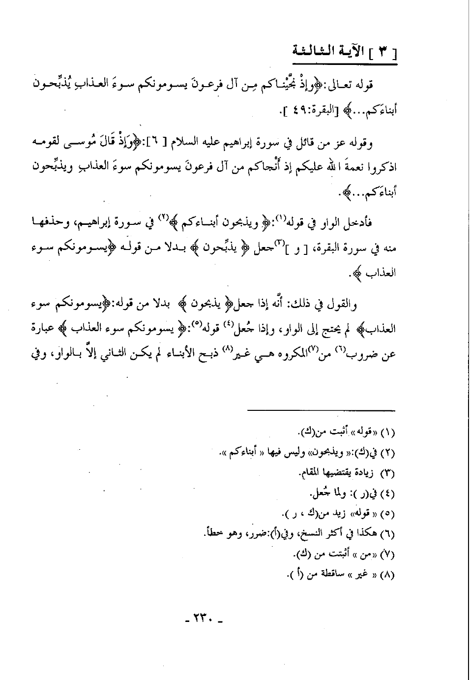 فأدخل الواو في قوله: (ويذبحون أبناءكم) في سورة إبراهيم، وحذفها منه في سورة البقرة، وجعل (يذبحون) بدلا من قوله (يسومونكم سوء العذاب) .