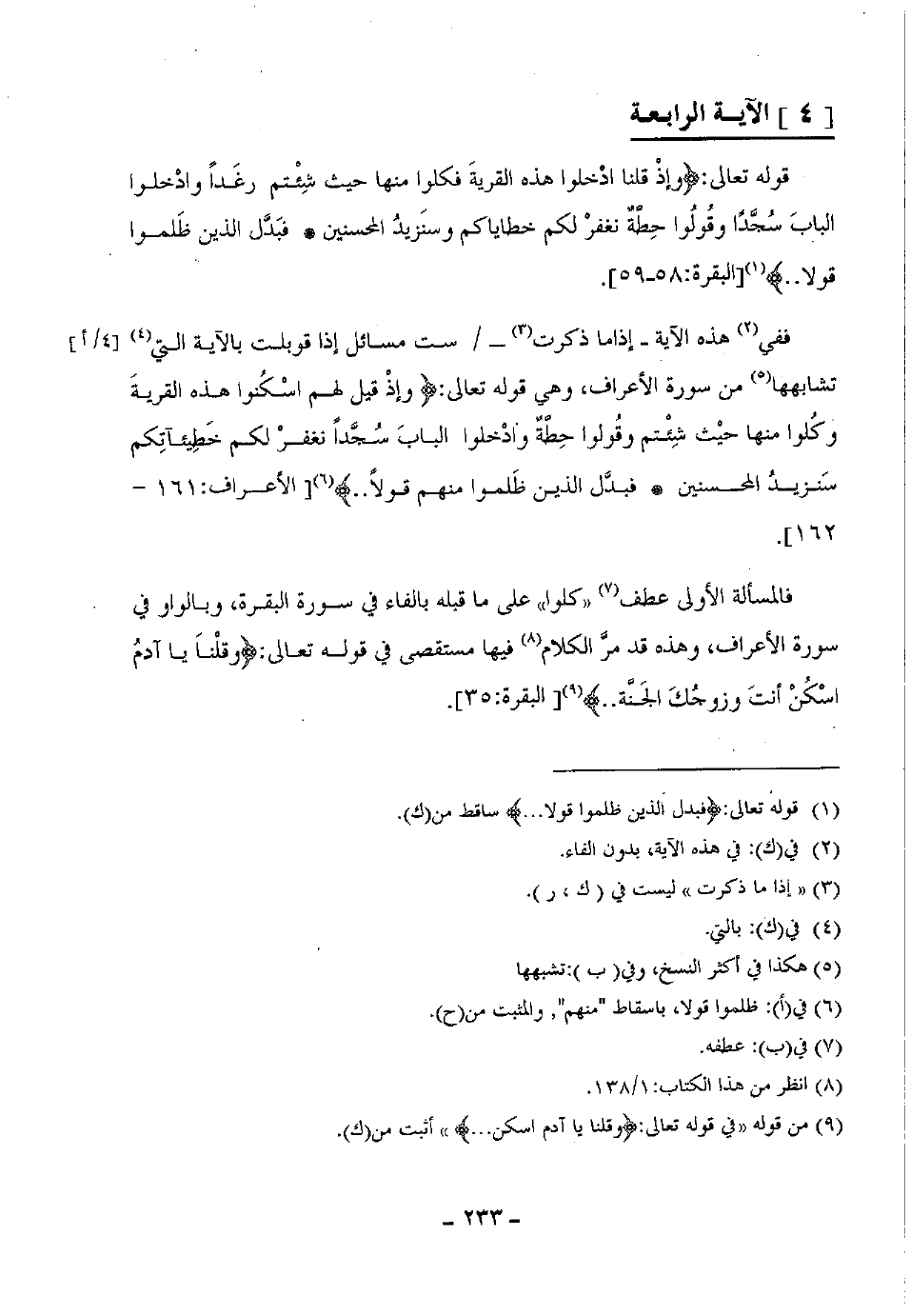 ففي هذه الآية إذا ما ذكرت ست مسائل إذا قوبلت بالآية التي تشابهها من سورة الأعراف، وهي قوله تعالى: (وإذ قيل لهم اسكونوا هذه القرية وكلوا منها حيث شئتم وقولوا حطة وادخلوا الباب سجدا نغفر لكم خطيئاتكم سنزيد المحسنين فبدل الذين ظلموا منهم قولا..) الأعراف: 161-162
