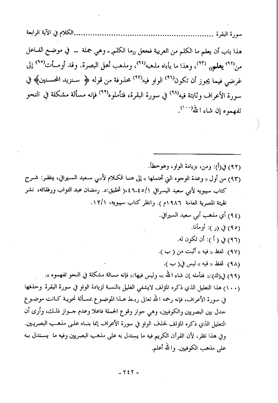 هذا باب أن يعلم ما الكلم من العربية فجعل ما الكلم وهي جملة في موضع الفاعل من يعلم، وهذا ما يأبه مذهبه، ومذهب أهل البصرة وقد أومأت إلى غرضي فيما يجوز أن تكون الواو فيه محذوفة من قوله (سنزيد المحسنين) في سورة الأعراف وثابتة فيه في سورة البقرة، فتأملوه فإنه مسألة مشكلة في النحو تفهموه إن شاء الله.