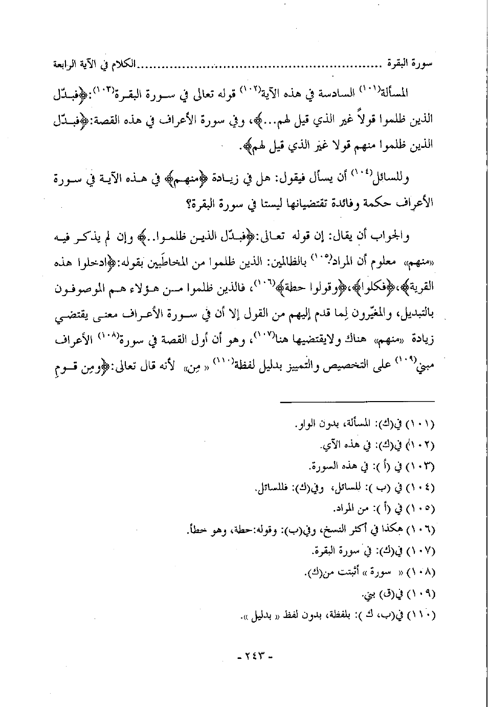 والجواب أن يقال: إن قوله تعالى: (فبدل الذين ظلموا..) وإن لم يذكر فيه منهم معلوم أن المراد بالظالمين: الذين ظلموا من المخاطبين بقوله: (ادخلوا هذه القرية) ، (فكلوا) ، (وقولا حطة) ، فالذين ظلموا من هؤلاء هم الموصوفون بالتبديل، والمغيرون لما قدم إليهم من القول إلا أن في سورة الأعراف معنى يقتضي زيادة منهم هناك ولا يقتضيها هنا، وهو أن أول القصة في سورة الأعراف مبني على التخصيص والتمييز بدليل لفظ من لأنه قال تعالى: (ومن قوم