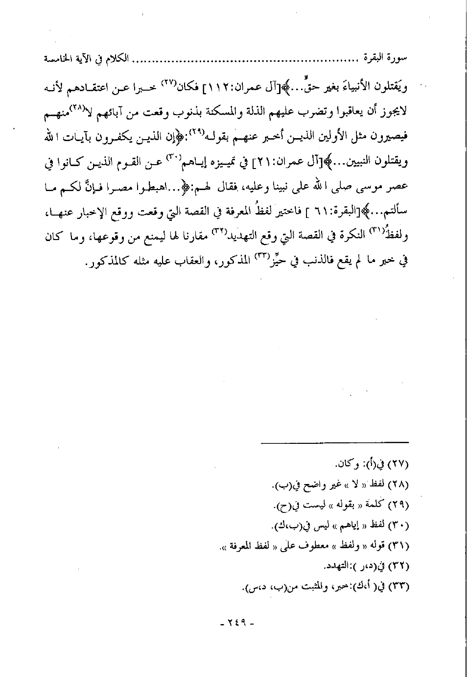 عصر موسى صلى الله على نبينا وعليه، فقال لهم: (..اهبطوا مصرا فإن لكم ما سألتم..) البقرة: 61 فأختير لفظ المعرفة في القصة التي وقعت ووقع الإخبار عنها، ولفظ النكرة في القصة التي وقع التهديد مقارنا لها ليمنع من وقوعها، وما كان في خبر ما لم يقع فالذنب في حيز المذكور، والعقاب عليه مثله كالمذكور.