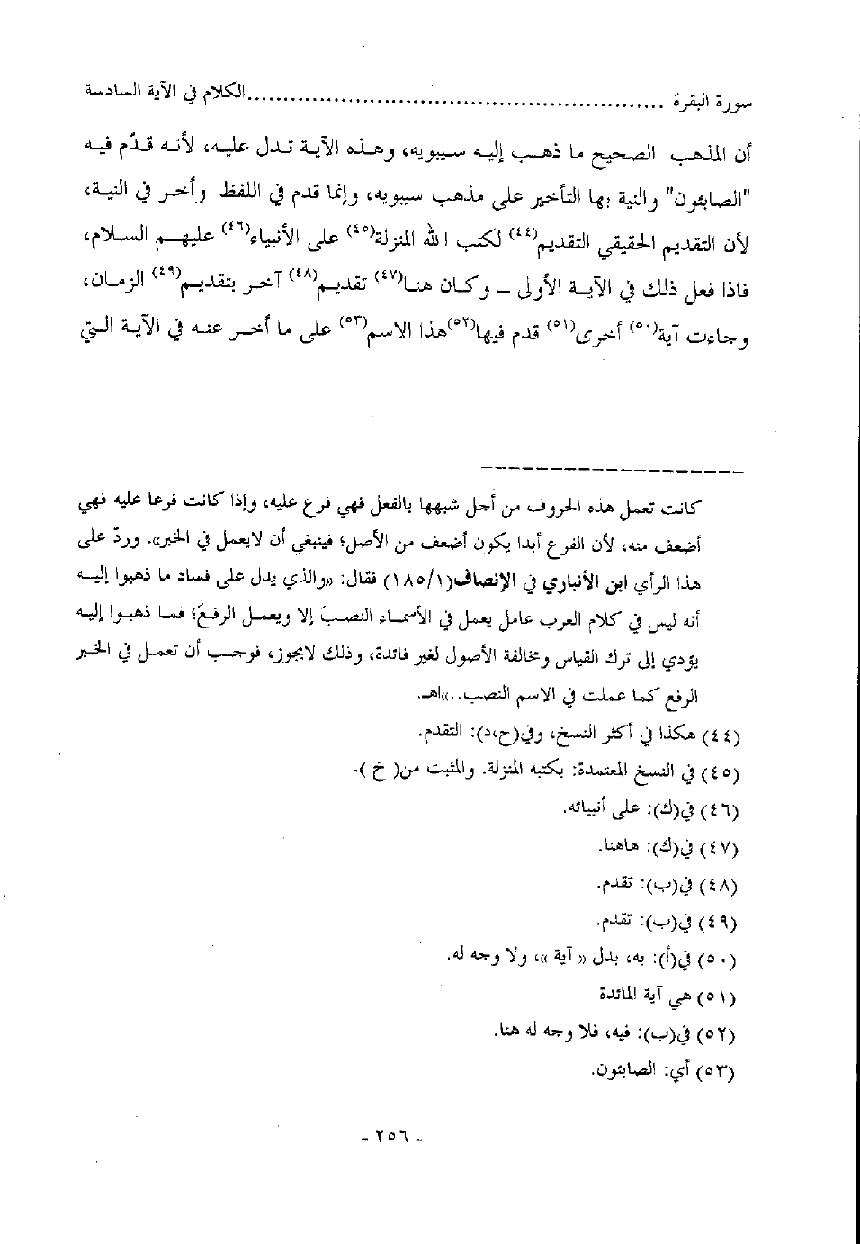 أن المذهب الصحيح ما ذهب إليه سيبويه، وهذه الآية تدل عليه، لأنه قدم فيه الصابئون والنية بها التأخير على مذهب سيبويه، وإنما قدم في اللفظ وأخر في النية، لأن التقديم الحقيقي التقديم لكتب الله المنزلة على الأنبياء عليهم السلام، فإذا فعل ذلك في الآية الأولى وكان هنا تقديم آخر بتقديم الزمان، وجاءت آية أخرى قدم فيها هذا الاسم على ما أخر عنه في الآية التي
