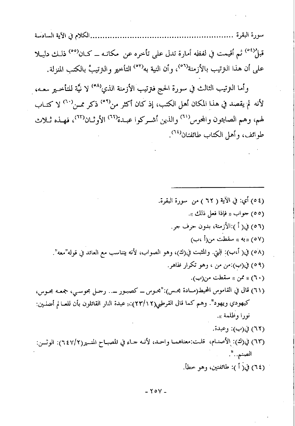 وأما الترتيب الثالث في سورة الحج فترتيب الأزمنة الذي لا نية للتأخير معه، لأنه لم يقصد في هذا المكان أهل الكتب، إذ كان أكثر من ذكر ممن لا كتاب لهم، وهم الصابئون والمجوس والذين أشركوا عبدة الأوثان، فهذه ثلاث طوائف، وأهل الكتاب طائفتان.