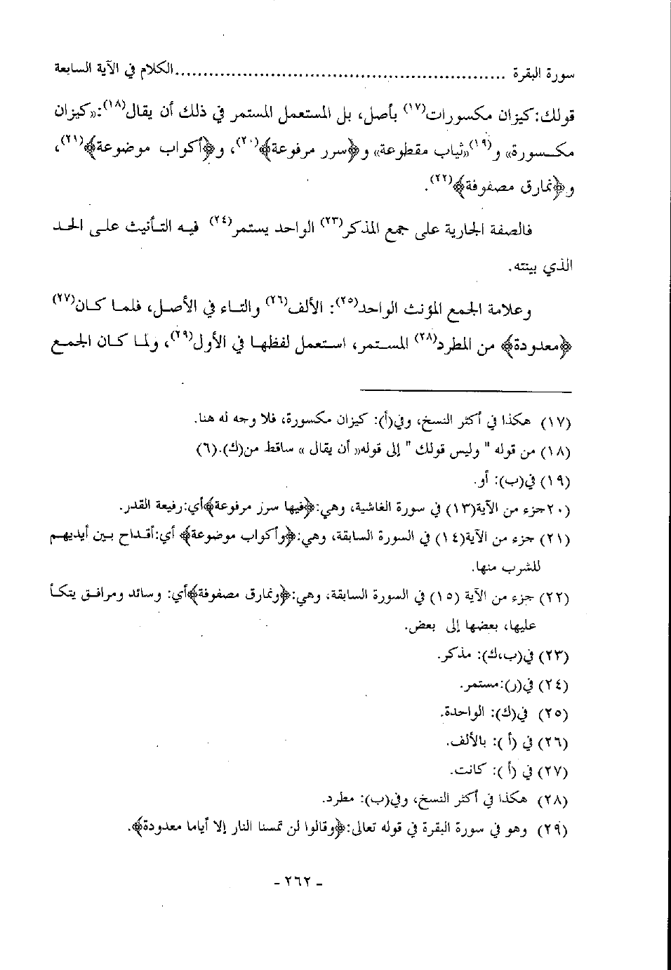 قولك: كيزان مكسورات بأصل، بل المستعمل المستمر في ذلك أن يقال: " كيزان مكسورة" و" ثياب مقطوعة" و" سرر مرفوعة" و"أكواب موضوعة" و" نمارق مصفوفة".