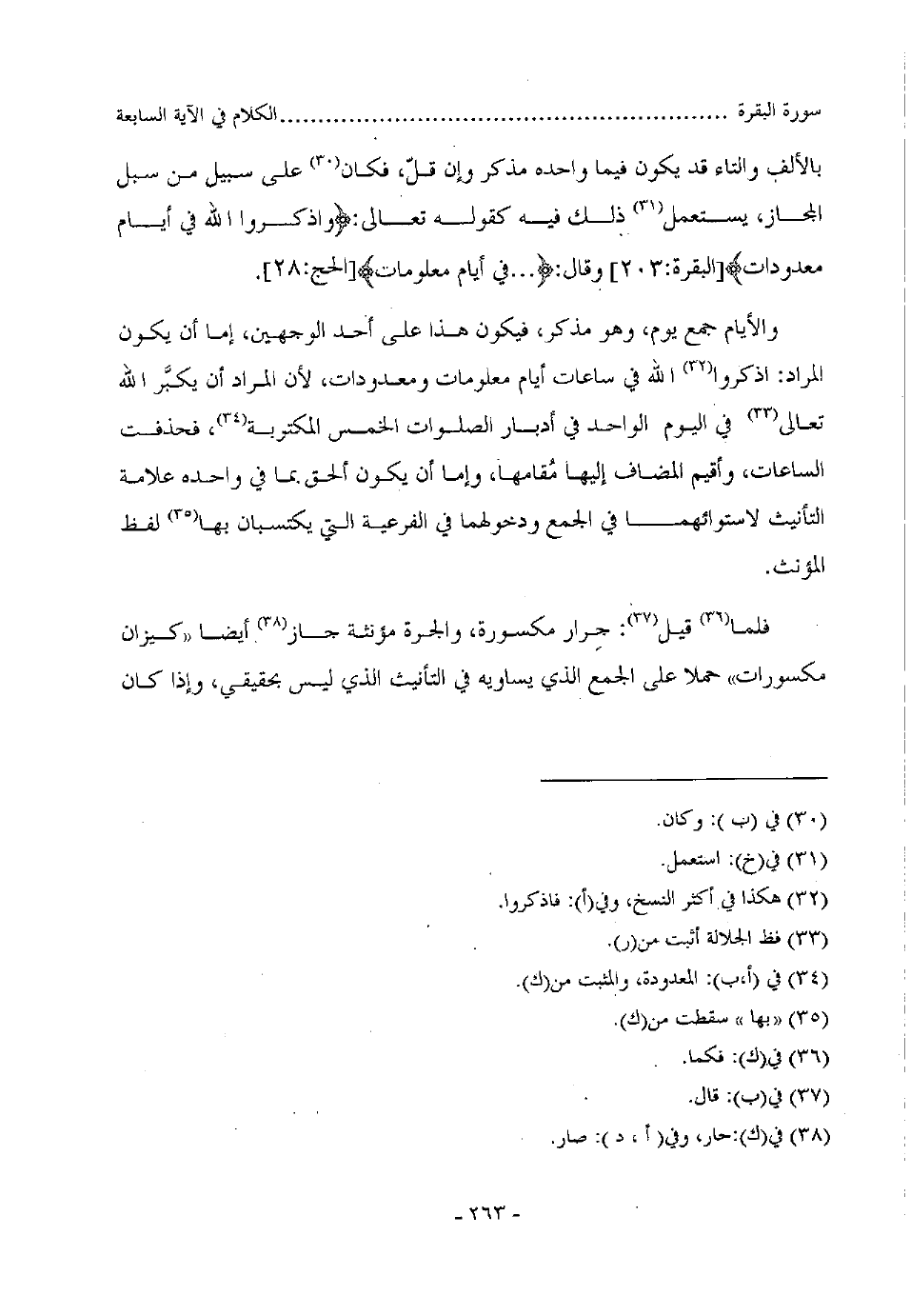بالألف والتاء قد يكون فيما واحد مذكر وإن قل، فكان على سبيل من سبل المجاز، يستعمل ذلك فيه كقوله تعالى: " واذكر الله في أيام معدودات". (البقرة: 203) وقال: ( ... في أيام معلومات) الحج: 28.