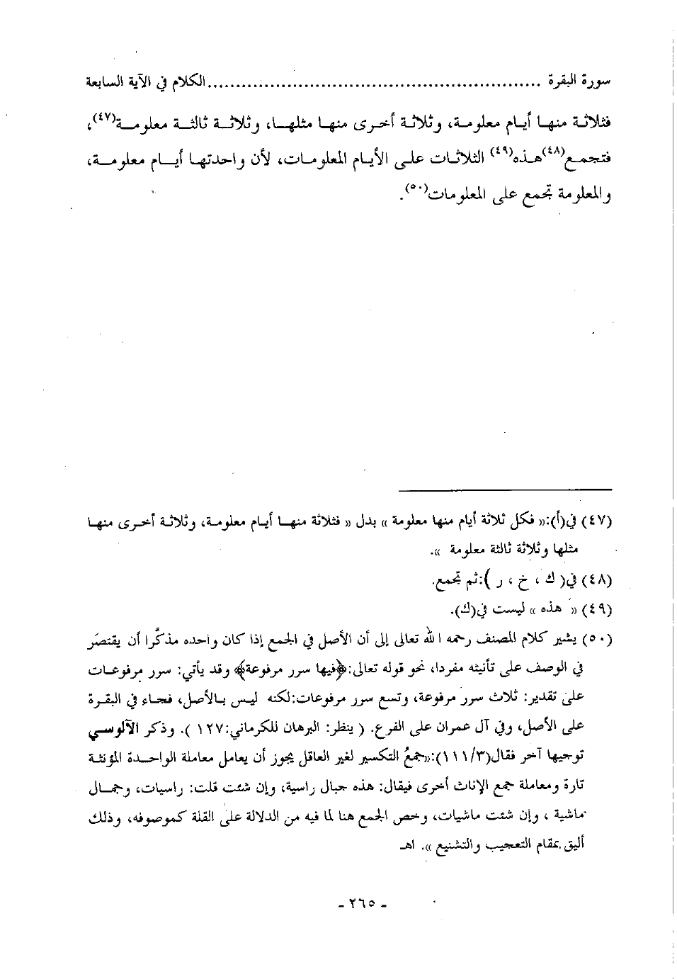 فثلاثة منها أيام معلومة، وثلاثة أخرى منها مثلها، وثلاثة ثالثة معلومة، فتجمع هذه الثلاثات على الأيام المعلومات، لأن واحدتها أيام معلومة، والمعلومة تجمع على المعلومات.