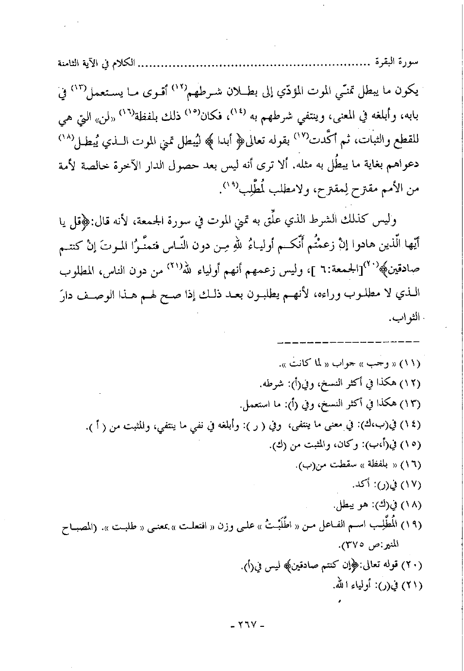 وليس كذلك الشرط الذي علق به تمني الموت في سورة الجمعة، لأنه قال: (قل يا أيها الذين هادوا إن زعمكم أنكم أولياء الله من دون الناس فتمنوا الموت إن كنتم صادقين) (الجمعة: 6) ، وليس زعمهم أنهم أولياء الله من دون الناس، المطلوب الذي لا مطلوب وراءه، لأنهم يطلبون بعد ذلك إذا صح لهم هذا الوصف دار الثواب.