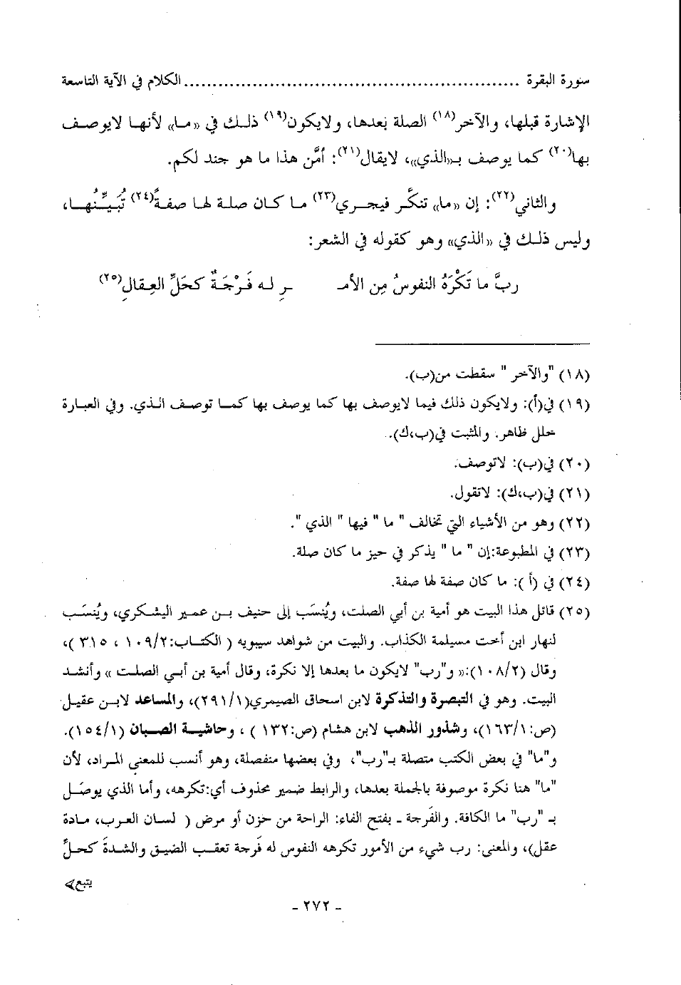 والثاني: إن" ما" تنكر فيجري ما كان صلة لها صفة تبينها، وليس ذلك في" الذي"وهو كقوله