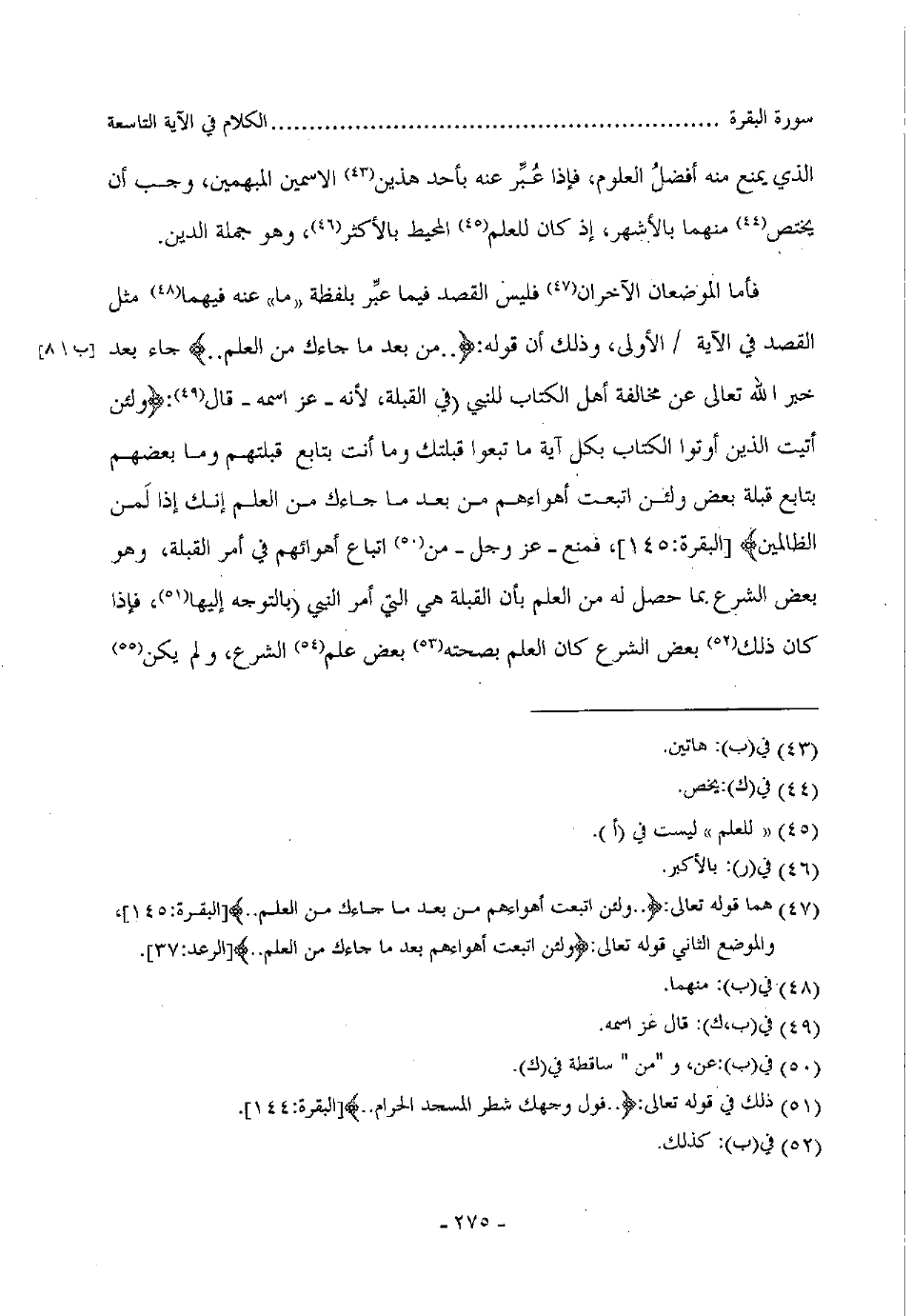 فأما الموضعان الآخران فليس القصد فيما عبر بلفظة ما عنه فيهما مثل القصد في الآية الأولى، وذلك أن قوله: (..من بعد ما جاءك من العلم ... ) جاء بعد خبر الله تعالى عن مخالفة أهل الكتاب للنبي صلى الله عليه وسلم في القبلة، لأنه عز اسمه قال: (ولئن أتيت الذين أوتوا الكتاب بكل الآية ما تبعوا قبلتك وما أنت بتابع قبلتهم وما بعضهم بتابع قبلة بعض ولئن اتبعت أهوائهم من بعد ما جاءك من العلم إنك إذا لمن الظالمين..) البقرة: 145، فمنع عز وجل من اتباع أهوائهم في أمر القبلة، وهو بعض الشرع بما حصل له من العلم بأن القبلة هي التي أمر النبي صلى الله عليه وسلم بالتوجه إليها، فإذا كان ذلك بعض الشرع كان العلم بصحته بعض علم الشرع، ولم يكن