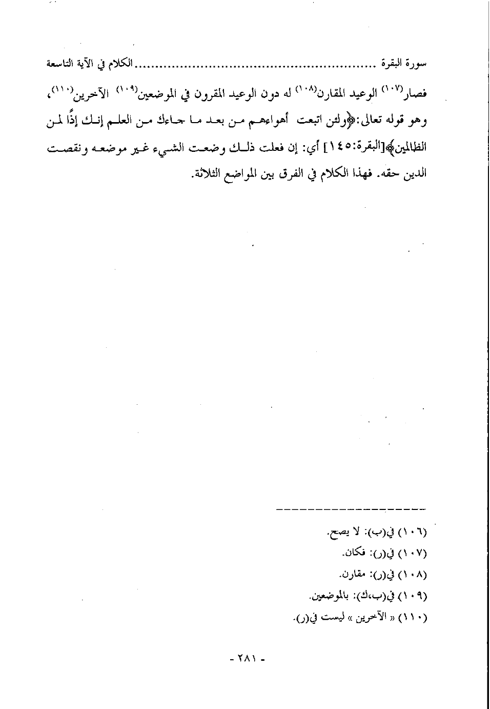 فصار الوعيد المقارن له دون الوعيد المقرون في الموضعين الآخرين، وهو قوله تعالى: (ولئن اتبعت أهواءهم من بعد ما جاءك من العلم إن إذا لمن الظالمين) البقرة: 145 أي إن فعلت ذلك وضعت الشيء غير موضعه ونقصت الدين حقه فهذا الكلام في الفرق بين المواضع الثلاثة.