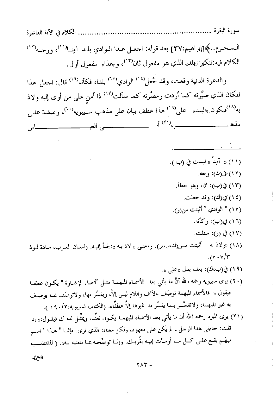 المحرم) ابراهيم: 37 بعد قوله: اجعل هذا الوادي بلدا آمنا، ووجه الكلام فيه: تنكير بلد الذي هو مفعول ثان، وهذا مفعول أول.