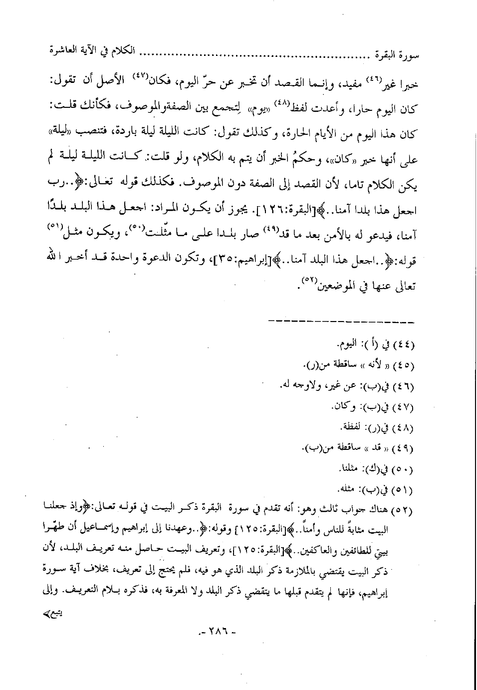 خبرا غير مفيد، وإنما القصد أن تخبر عن حر اليوم، فكان الأصل أن تقولك كان اليوم حارا، وأعدت لفظ يوم لتجمع بين الصفة والموصوف، فكأنك قلت: كان هذا اليوم من الأيام الحارة، وكذلك تقول: كانت الليلة ليلة باردة، فتنصب ليلة على أنها خبر كان وحكم الخبر أن يتم به الكلام، ولم قلت: كانت الليلة ليلة لم يكن الكلام تاما، لأن القصد إلى الصفة دون الموصوف فكذلك قوله تعالى: (.. رب اجعل هذا بلدا آمنا..) البقرة: 126 يجوز أن يكون المراد: اجعل هذا البلد بلدا آمنا، فيدعو له بالأمن بعد ما قد صار بلدا على ما مثلت، ويكون مثل قوله: (..اجعل هذا البلد آمنا..) إبراهيم: 35، وتكون الدعوة واحدة قد أخبر الله تعالى عنها في الموضعين.