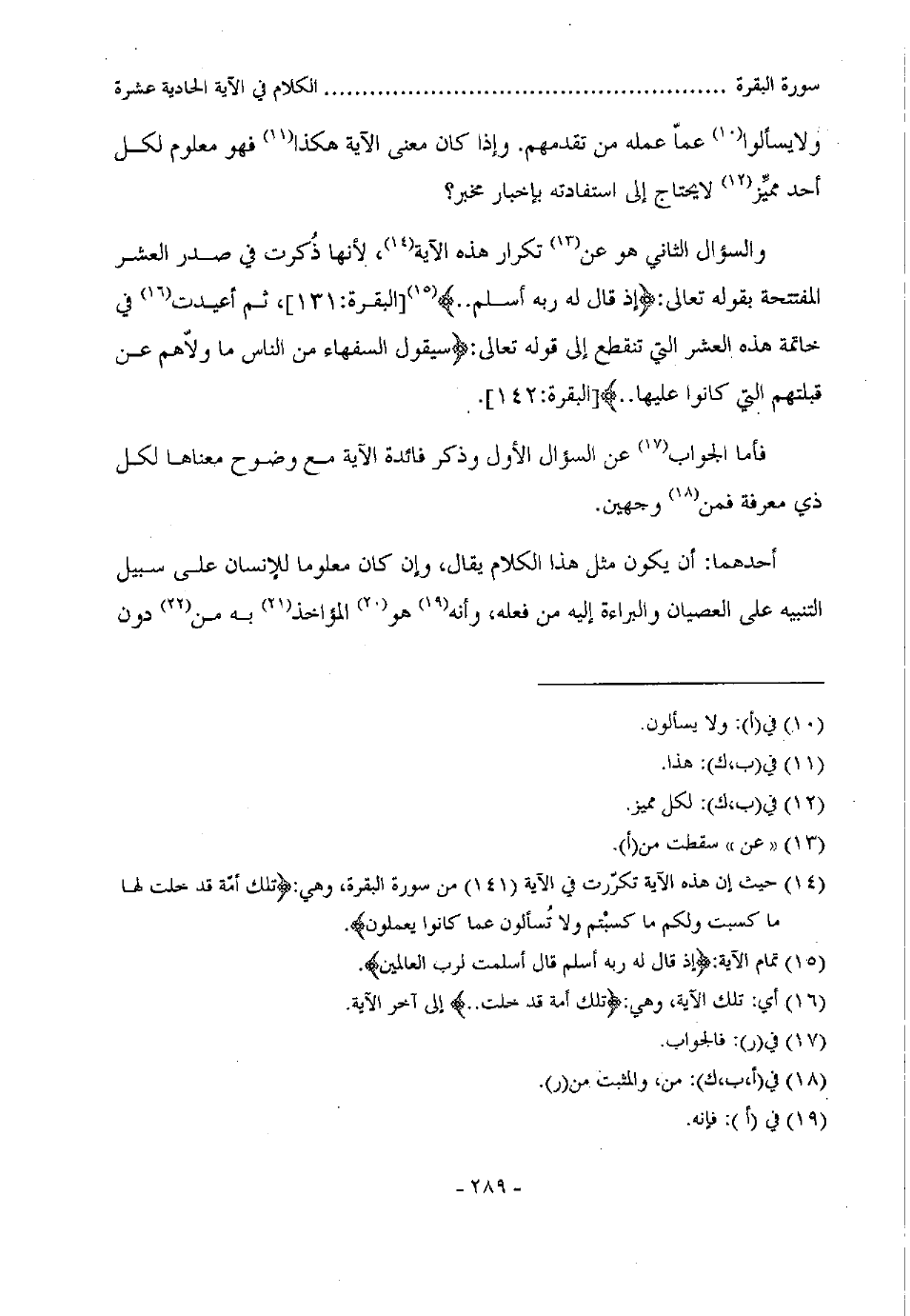 والسؤال الثاني هو عن تكرار هذه الآية، لأنها ذكرت في صدر العشر المفتحة بقوله تعالى: (إذ قال له ربه أسلم..) البقرة: 131، ثم أعيدت في خاتمة هذه العشر التي تنقطع إلى قوله تعالى: (سيقول السفهاء من الناس ما ولاهم عن قبلتهم التي كانوا عليها..) البقرة: 142.