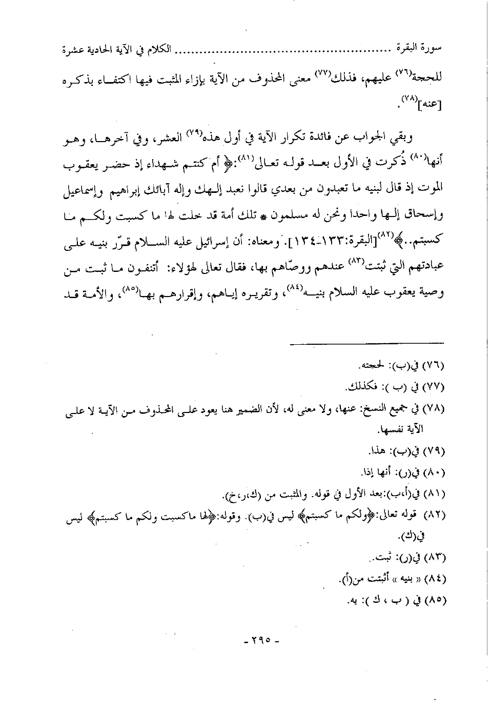 وبقي الجواب عن فائدة تكرار الآية في أول هذه العشر، وفي آخرها، وهو أنها ذكرت في الأول بعد قوله تعالى: (أم كنتم شهذاء إذ حضر يعقوب الموت إذ قال لبنيه ما تعبدون من بعدي قالوا نعبد إلهك وإله آبائك إبراهيم وإسماعيل وإسحاق إلها واحدا ونحن له مسلمون * تلك أمة قد خلت لها ما كسبت ولكم ما كسبتم..) البقرة: 133 -134 ومعناه: أن إسرائيل عليه السلام قرر بنيه على عبادتهم التي ثبتت عندهم ووصاهم بها، فقال تعالى لهؤلاء: أتنفون ما ثبت من وصية يعقوب عليه السلام بنيه، وتقريره إياهم، وإقرارهم بها، والأمة قد