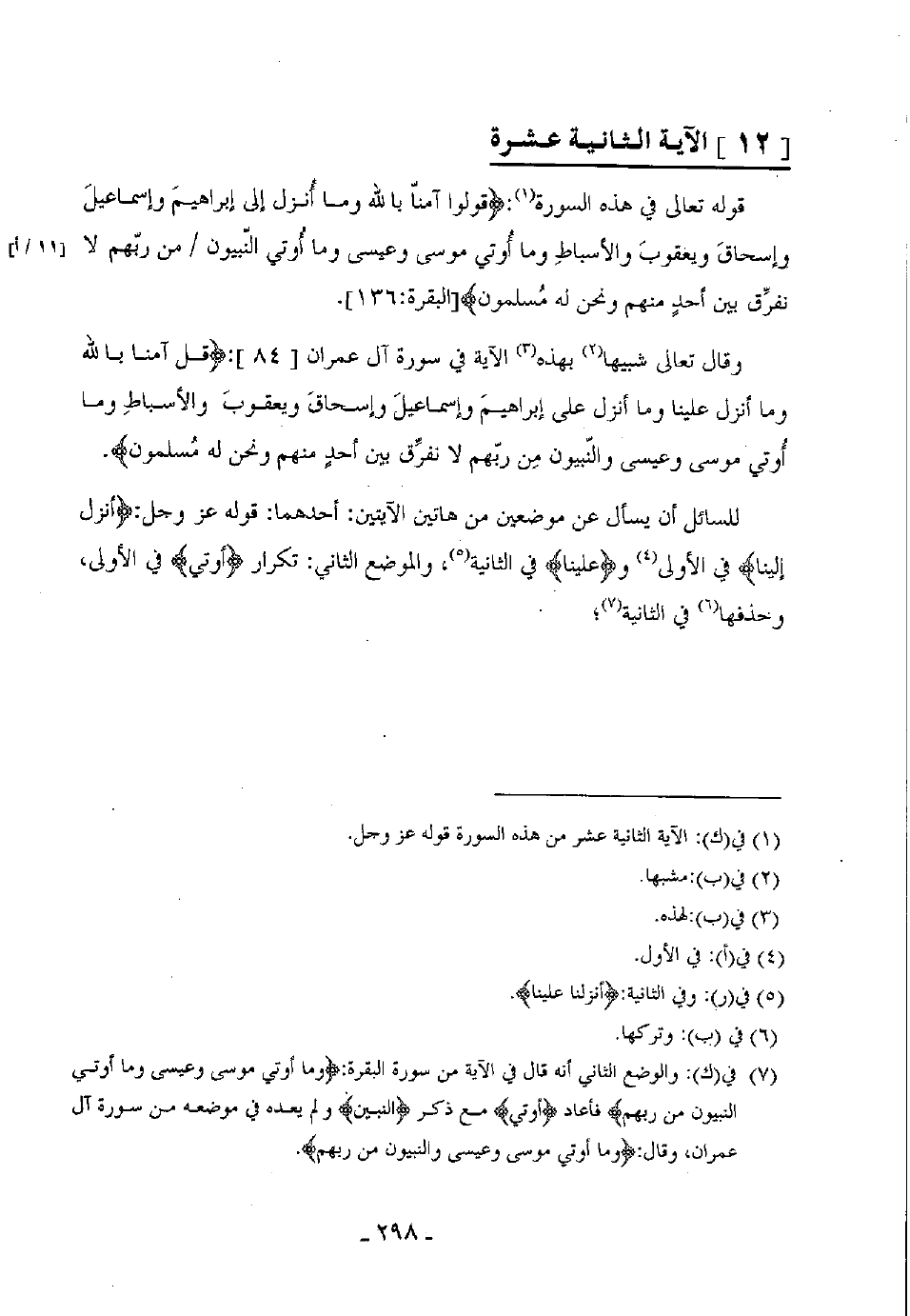 وقال تعالى شبيها بهذه الآية في سورة آل عمران 48: (قل آمنا بالله وما أنزل علينا وما أنزل على إبراهيم وإسماعيل وإسحاق ويعقوب والأسباط وما أوتي موسى وعيسى والنبيون من ربهم لا نفرق بين أحد منهم ونحن له مسلمون) .