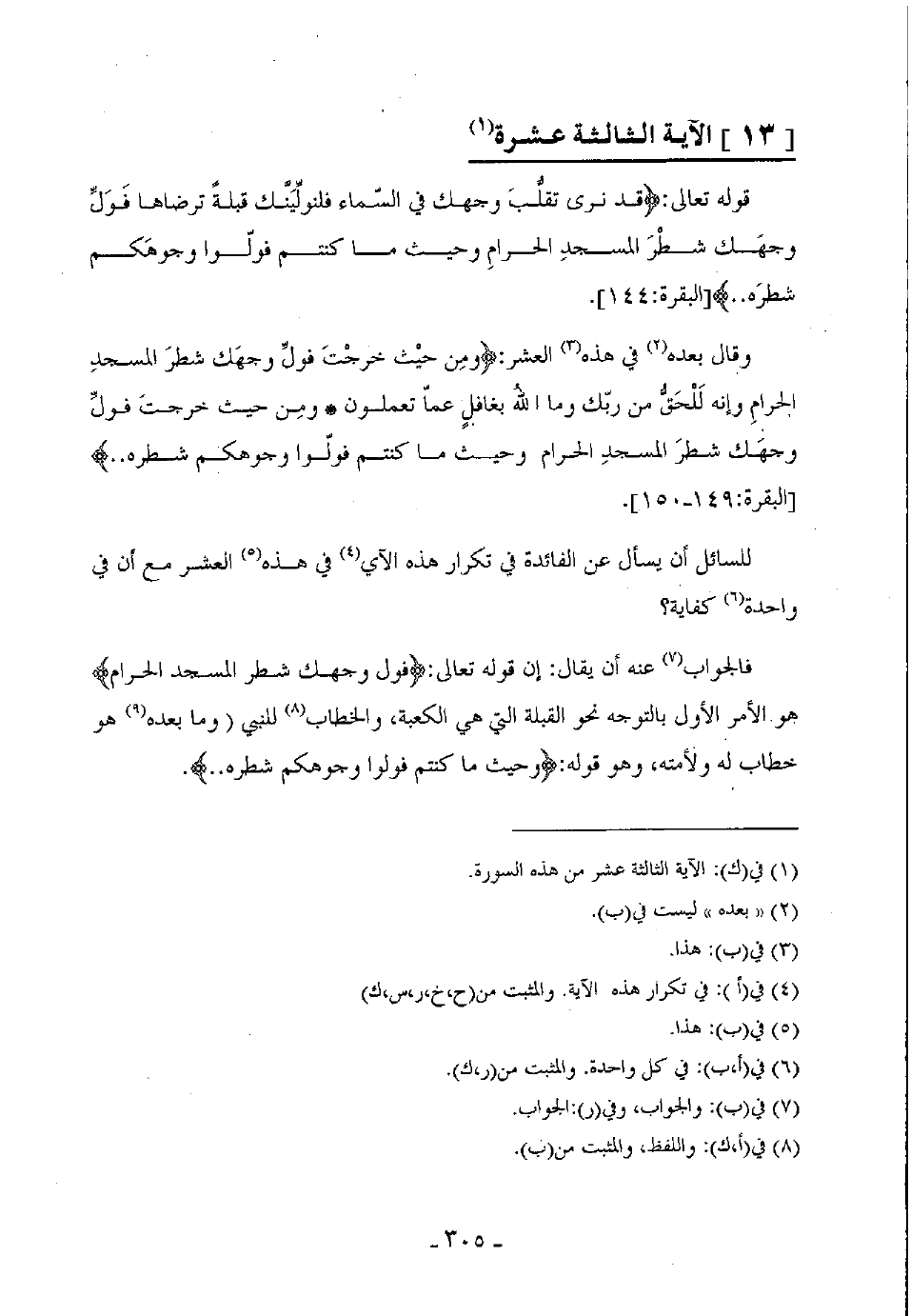 وقال بعده في هذه العشر: (ومن حيث خرجت فول وجهك شطر المسجد الحرام وإنه للحق من ربك وما الله بغافل عما تعلمون. ومن حيث خرجت فول وجهك شطر المسجد الحرام وحيث ما كنتم فولوا وجوهكم شطره..) (البقرة: 149-150) .