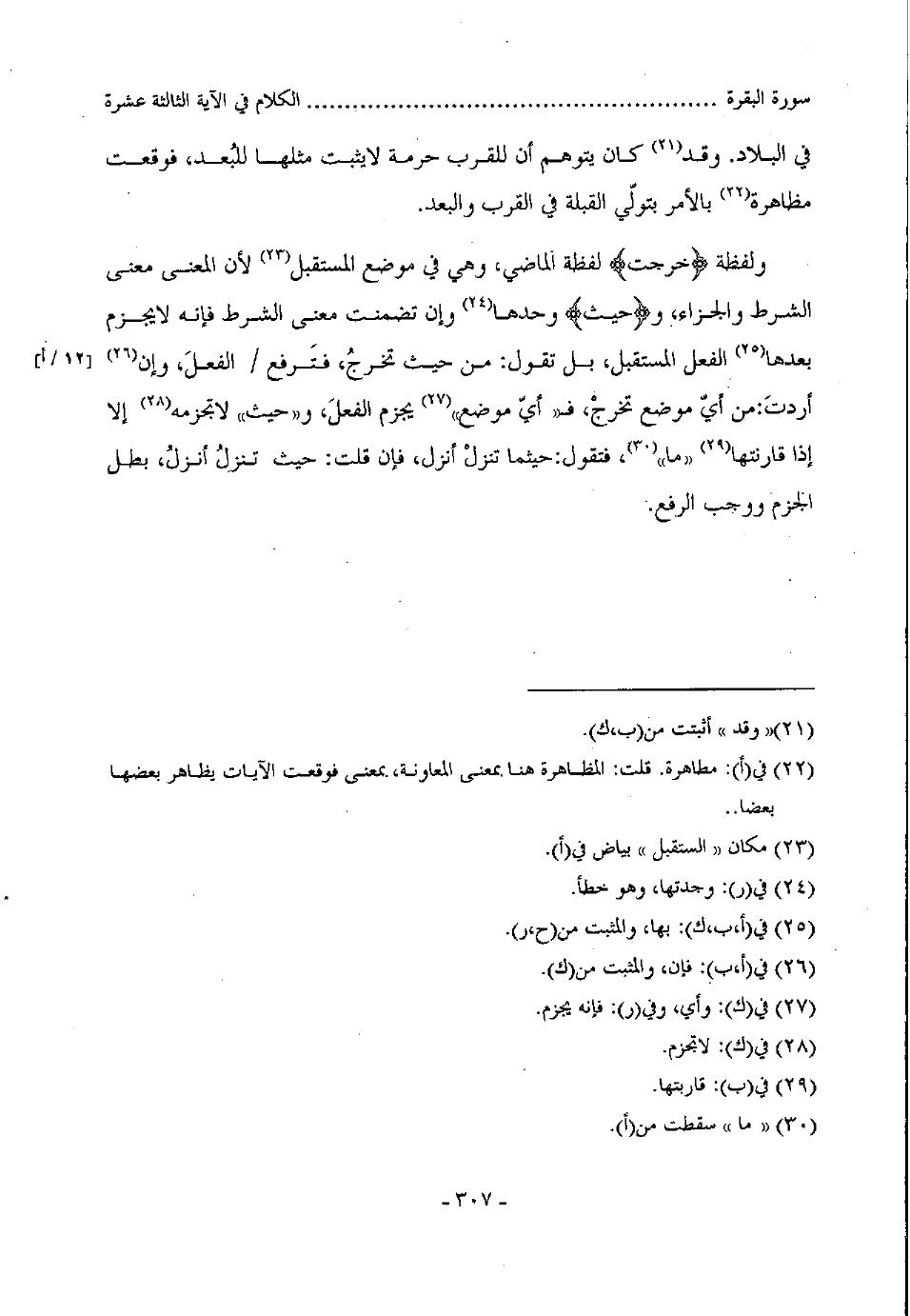 ولفظة (خرجت) لفظة الماضي، وهي في موضع المستقبل لأن المعنى الشرط والجزاء، و (حيث) وحدها وإن تضمنت معنى الشرط فإنه لا يجوز بعدها الفعل المستقبل، بل تقول: من حيث تخرج، فترفع/ الفعل، وإن أردت: من أي موضع تخرج، ف" أي موضع" يجزم الفعل، و"حيث" لا تجزمه إلا إذا قارنتها "ما"، فتقول: حيثما تنزل أنزل، فإن قلت: حيث تنزل أنزل، بطل الجزم ووجب الرفع.