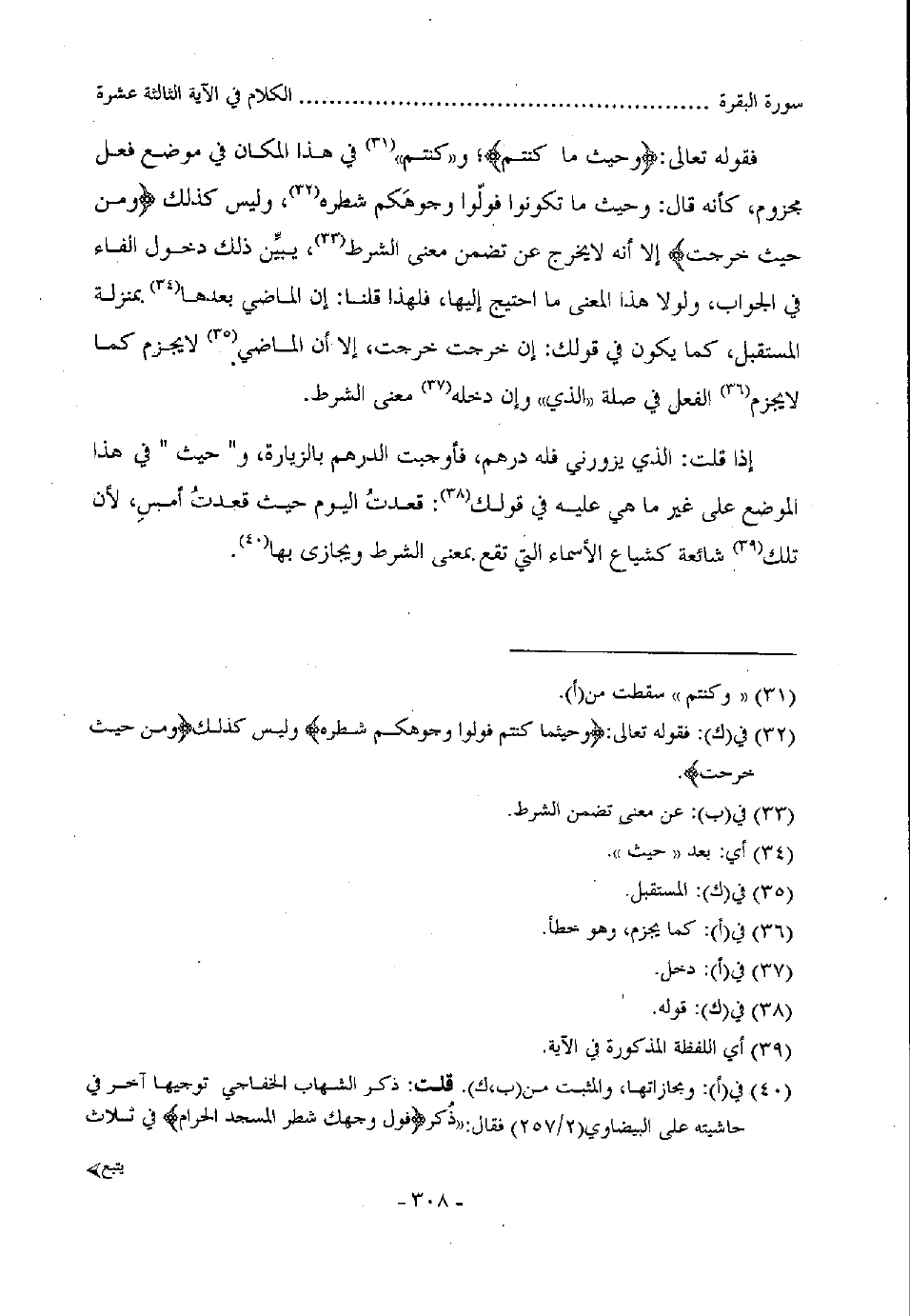 فقوله تعالى: (وحيث ما كنتم) ، و" كنتم" في هذا المكان في موضع الفعل مجزوم، كأنه قال: وحيث ما تكونوا فولوا وجوهكم شطره، وليس كذلك (ومن حيث خرجت) إلا أنه لا يخرج عن تضمن معنى الشرط، يبين ذلك دخول الفاء في الجواب، ولولا هذا المعنى ما احتيج إليها، فلهذا قلنا: إن الماضي بعدها بمنزلة المستقبل، كما يكون في قولك: إن خرجت خرجت، إلا أن الماضي لا يجزم كما لا يجزم الفعل في صلة الذي وإن دخله معنى الشرط.
