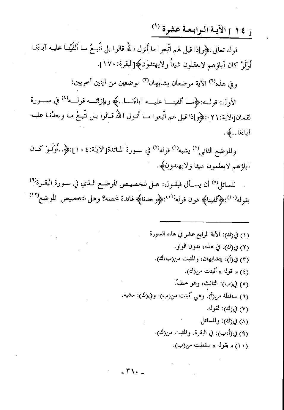 الأول: قوله: (ما ألفينا عليه آباءنا..) وبإزائه قوله في سورة لقمان الآية: 21: (وإذ قيل لهم اتبعوا ما أنزل الله قالوا بل نتبع ما وجدنا عليه آباءنا..) .