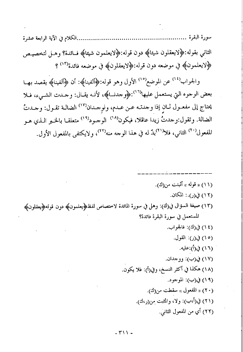 والجواب عن الموضع الأول وهو قوله: (ألفينا) : أن (ألفينا) يقصد بها بعض الوجوه التي ستعمل عليها: (وجدنا) ، لأنه يقال: وجدت الشيء، فلا يحتاج إلى مفعول ثان إذا وجدته عن عدم، ولوجدان الضالة الضالة تقول: وجدت الضالة وتقول: وجدت زيدا عاقلا، فيكون الوجود متعلقا بالخبر الذي هو المفعول الثاني، فلا بد له في هذا الوجه منه، ولا يكتفي بالمفعول الأول.