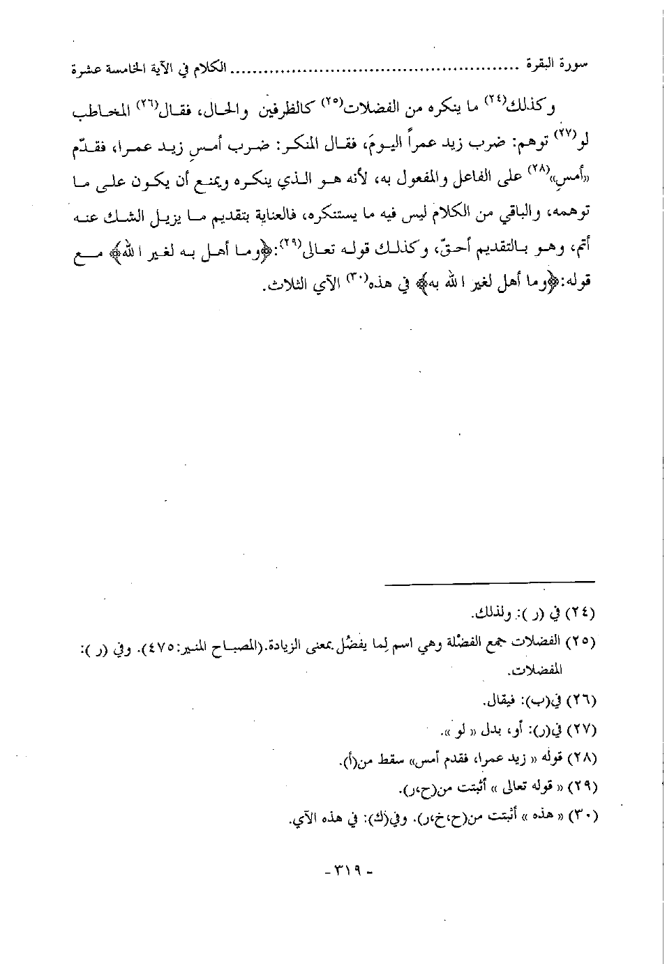 وكذلك ما ينكره من الفضلات كالظرفين والحال، فقال المخاطب لو توهم: ضرب زيد عمرا اليوم، فقال المنكر: ضرب أمس زيد عمرا، فقدم" أمس" على الفاعل والمفعول به، لأنه هو الذي ينكره ويمنع أن يكون على ما توهمه، والباقي من الكلام ليس فيه ما يستنكره، فالعناية بتقديم ما يزيل الشك عنه أتم، وهو بالتقديم أحق، وكذلك قوله تعالى: (وما أهل لغير الله) مع قوله: (وما أهل لغير الله به) في هذه الآي الثلاث.