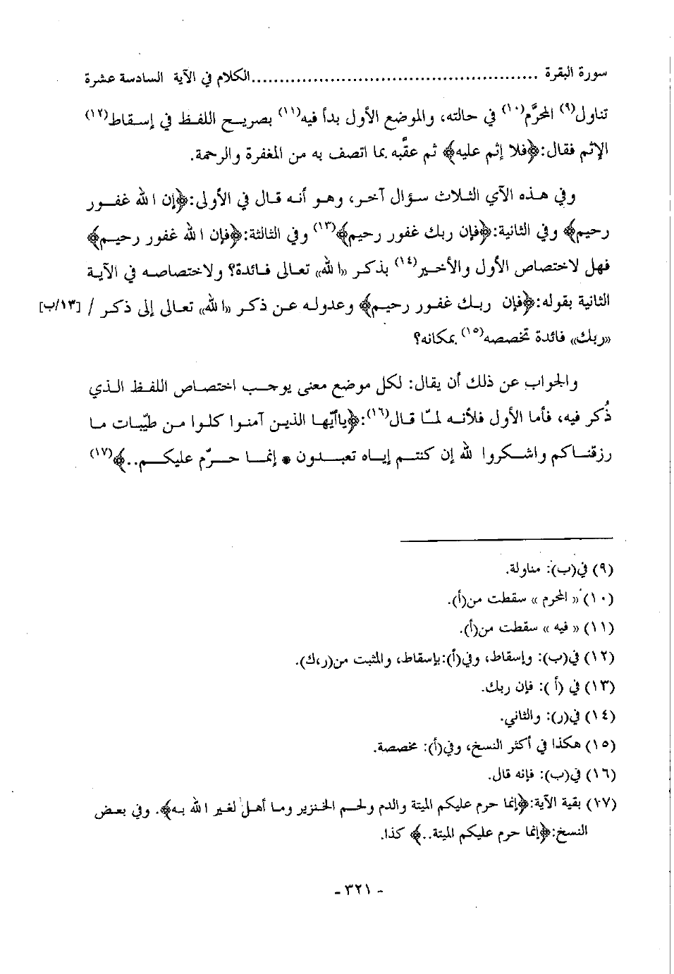 وفي هذه الآي الثلاث سؤال آخر، وهو أنه قال في الأولى: (إن الله غفور رحيم) وفي الثانية: (فإن ربك غفور رحيم) وفي الثالثة: (فإن الله غفور رحيم) فهل لاختصاص الأول والأخير بذكر"الله" تعالى فائدة؟ ولاختصاصه في الآية الثانية بقوله: (فإن ربك غفور رحيم) وعدو له عن ذكر "الله" تعالى إلى ذكر/"ربك" فائدة تخصصه بمكانه؟