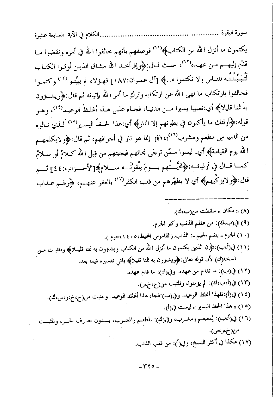 يكتمون ما أنزل الله من الكتاب) فوصفهم بأنهم خالفوا الله في أمره ونقضوا ما قدم إليهم من عهده، حيث قال: (وإذ أخذ الله ميثاق الذين أوتوا الكتاب لتبيننه للناس ولا تكتمونه..) "آل عمران: 187" فهؤلاء لم يبينوا وكتموا فخالفوا بارتكاب ما نهى الله عن ارتكابه وترك ما أمر الله بإتيانه ثم قال: (ويشترون به ثمنا قليلا) أي: نصيبا يسيرا من الدنيا، فجاء على هذا أغلظ الوعيد، وهو قوله: (أولئك ما يأكلون في بطونهم إلا النار) أي: هذا الحظ اليسير الذي نالوه من الدنيا من مطعم ومشرب إنما هو نار في أجوافهم، ثم قال: (ولا يكلمهم الله يوم القيامة) أي: ليسوا ممن ترجى نجاتهم فيجيئهم من قبل الله كلام أو سلام كما قال في أوليائه: (تحيتهم يوم يلقونه سلام) " الأحزاب: 44" ثم قال: (ولا يزكيهم) أي لا يطهرهم مكن الذنب الكفر بالعفو عنهم، (ولهم عذاب