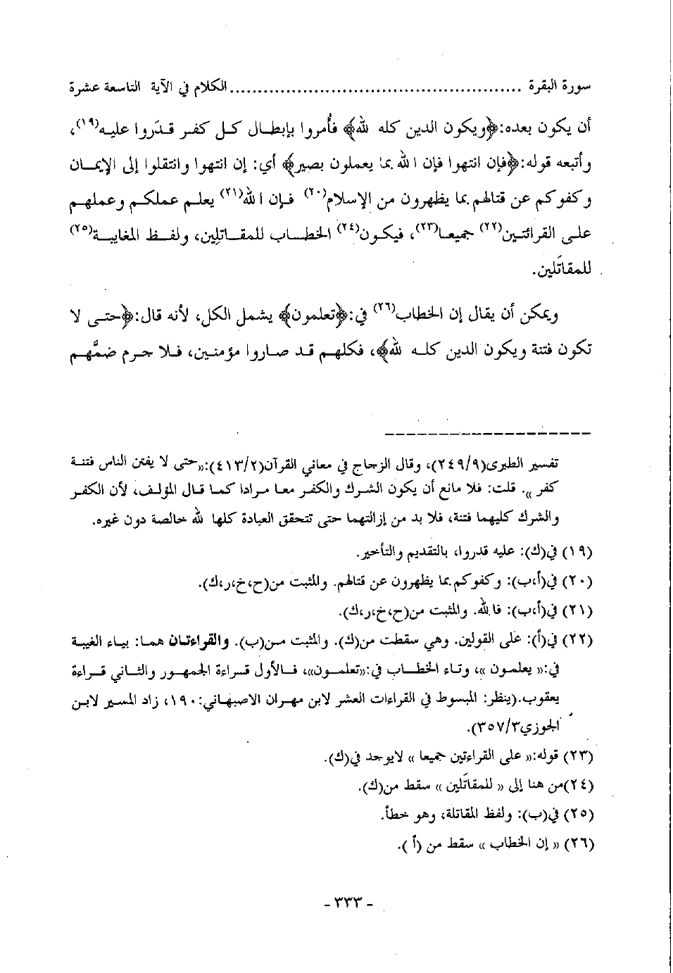 أن يكون بعده: (ويكون الدين كله لله) فأمروا بإبطال كل كفر قدروا عليه، واتبعه قوله: (فإن انتهوا فإن الله بما يعلمون بصير) أي: إن انتهوا وانتقلوا إلى الإيمان وكفوكم عن قتالهم بما يظهرون من الإسلام فإن الله يعلم عملكم وعملهم على القرائين جميعا، فيكون الخطاب للمقاتلين، ولفظ المغايبة للمقاتلين.