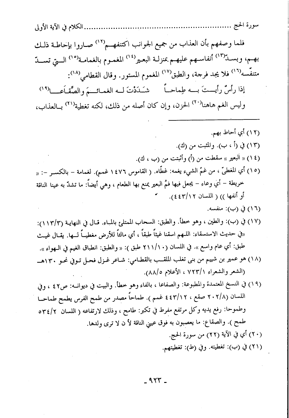 فلما وصفهم بأن العذاب من جميع الجوانب اكتنفهم صاروا بإحاطة ذلك بهم، وبسدّ أنفاسهم عليهم بمنزلة البعير المغموم بالغمامة التي تسدّ متنفّسه فلا يجد فرجة، والطبق (1) المغموم المستور.