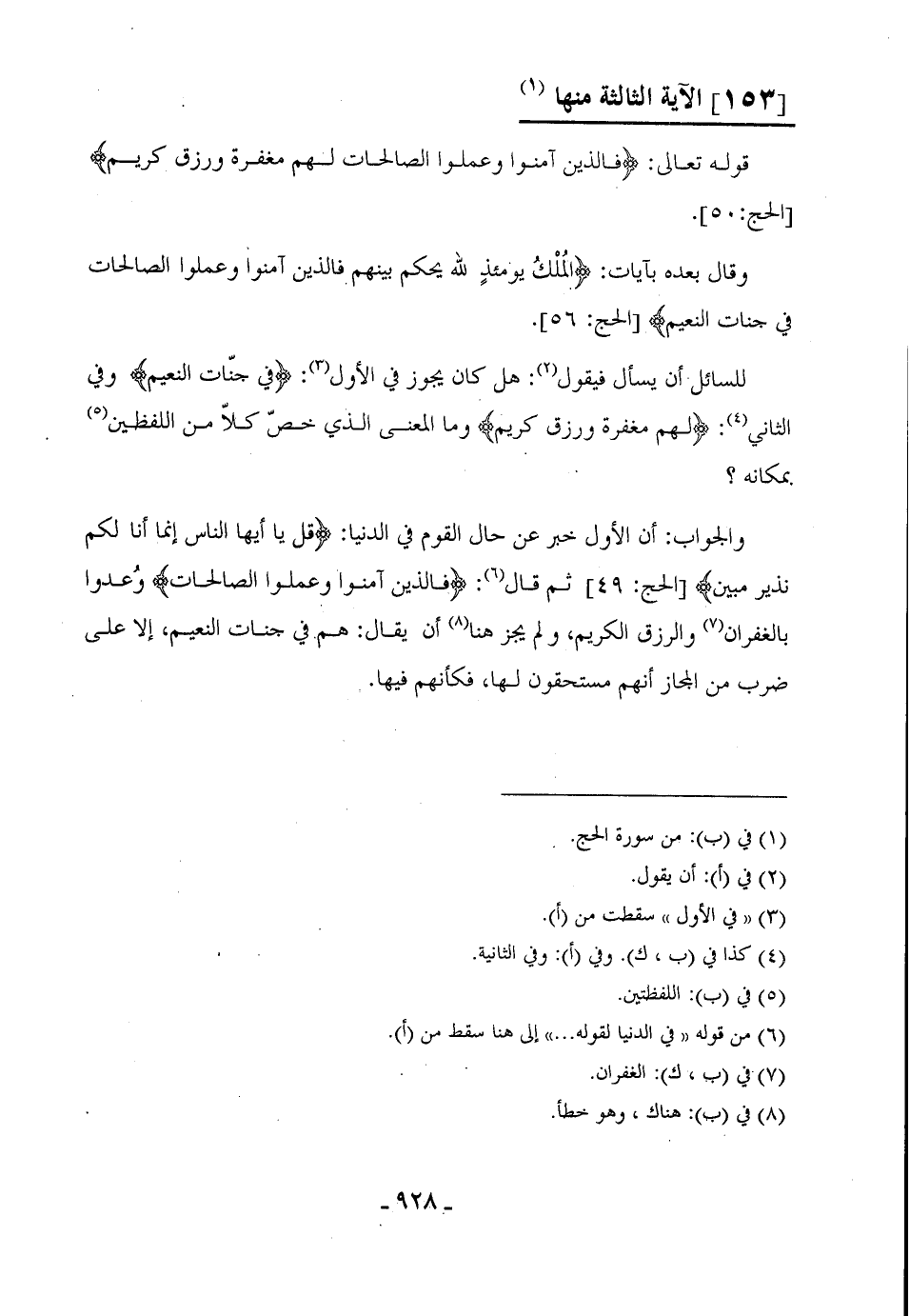 والجواب: أن الأول خبر عن حال القوم في الدنيا: (قل يا أيها الناس إنما أنا لكم نذير مبين) ، ثم قال: (فَالَّذِينَ آمَنُوا وَعَمِلُوا الصَّالِحَاتِ) وُعدوا بالغفران والرزق الكريم، ولم يجز هنا أن يقال: هم. في جنات النعيم، إلا على ضرب من المجاز أنهم مستحقون لها، فكأنهم فيها.