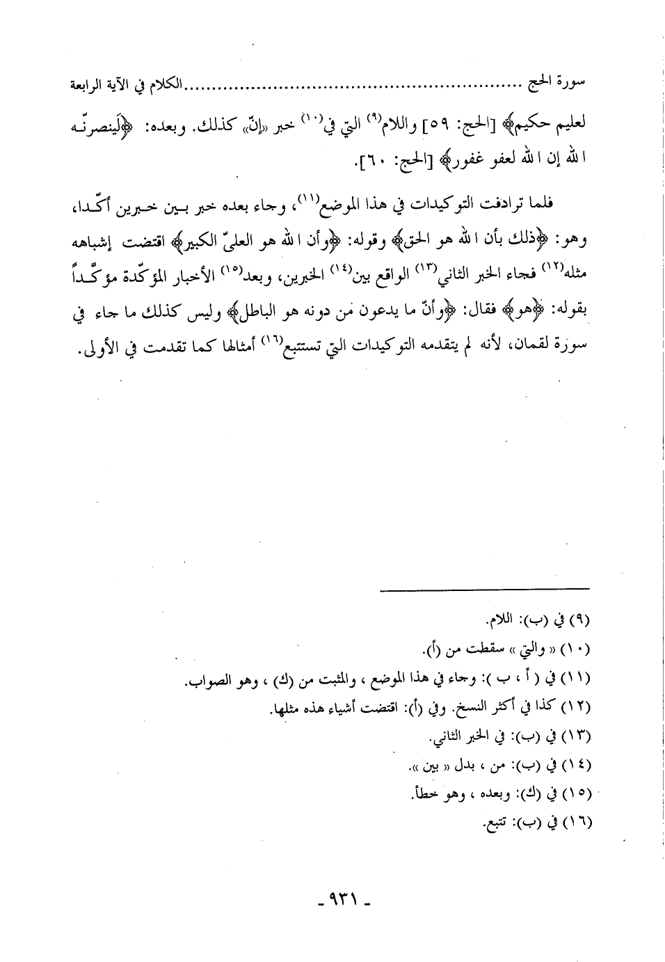 فلما ترادفت التوكيدات في هذا الموضع، وجاء بعده خبر بين خبرين أكّدا، وهو: (ذَلِكَ بِأَنَّ اللَّهَ هُوَ الْحَقُّ) وقوله: (وَأَنَّ اللَّهَ هُوَ الْعَلِيُّ الْكَبِيرُ (62)