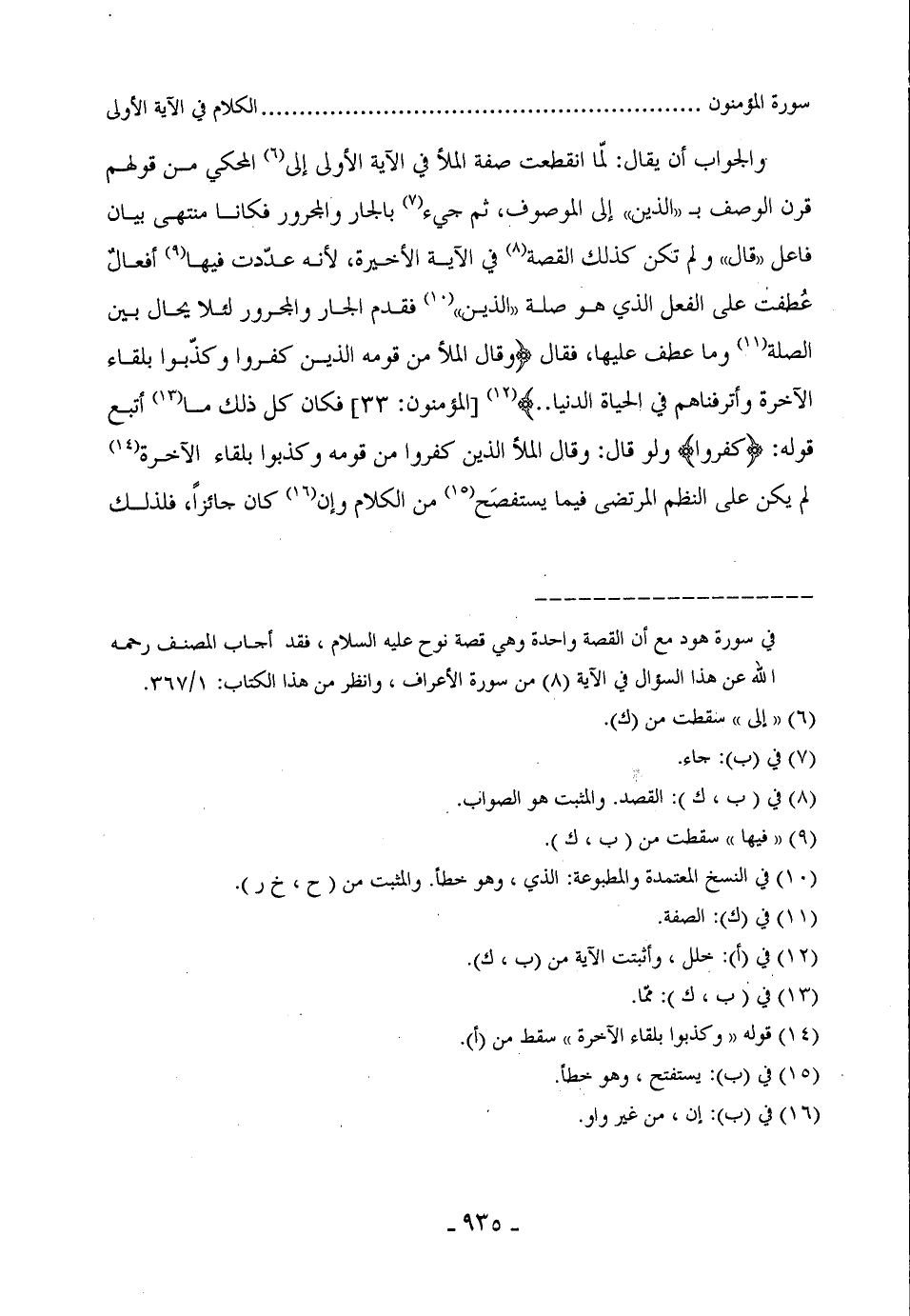 فكان كل ذلك ما أتبع قوله: "كفروا" ولو قال: وقال الملأ الذين كفروا من قومه وكذبوا بلقاء الآخرة لم يكن على النظم المرتضى فيما يستفصَح من الكلام وإن كان جائزاً، فلذلك