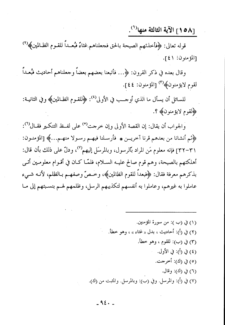 والجواب أن يقال: إن القصة الأولى وإن خرجت على لفظ التنكير فقال: (ثُمَّ أَنْشَأْنَا مِنْ بَعْدِهِمْ قَرْنًا آخَرِينَ (31) فَأَرْسَلْنَا فِيهِمْ رَسُولًا مِنْهُمْ ... ) ، فإنه معلوم مَن المراد بالرسول، وبالمرسَل إليهم، ودلّ على ذلك بأن قال: أهلكتهم بالصيحة، وهم قوم صالح عليه السلام، فلمّا كان في أقوام معلومين أتى بذكرهم معرفة فقال: (فبعداً للقوم الظالمين) وخصّ وصفهم بالظلم، لأنه شيء عاملوا به غيرهم، وعاملوا به أنفسهم لتكذيبهم الرسل، وظلمهم لهم بنسبتهم إلى ما