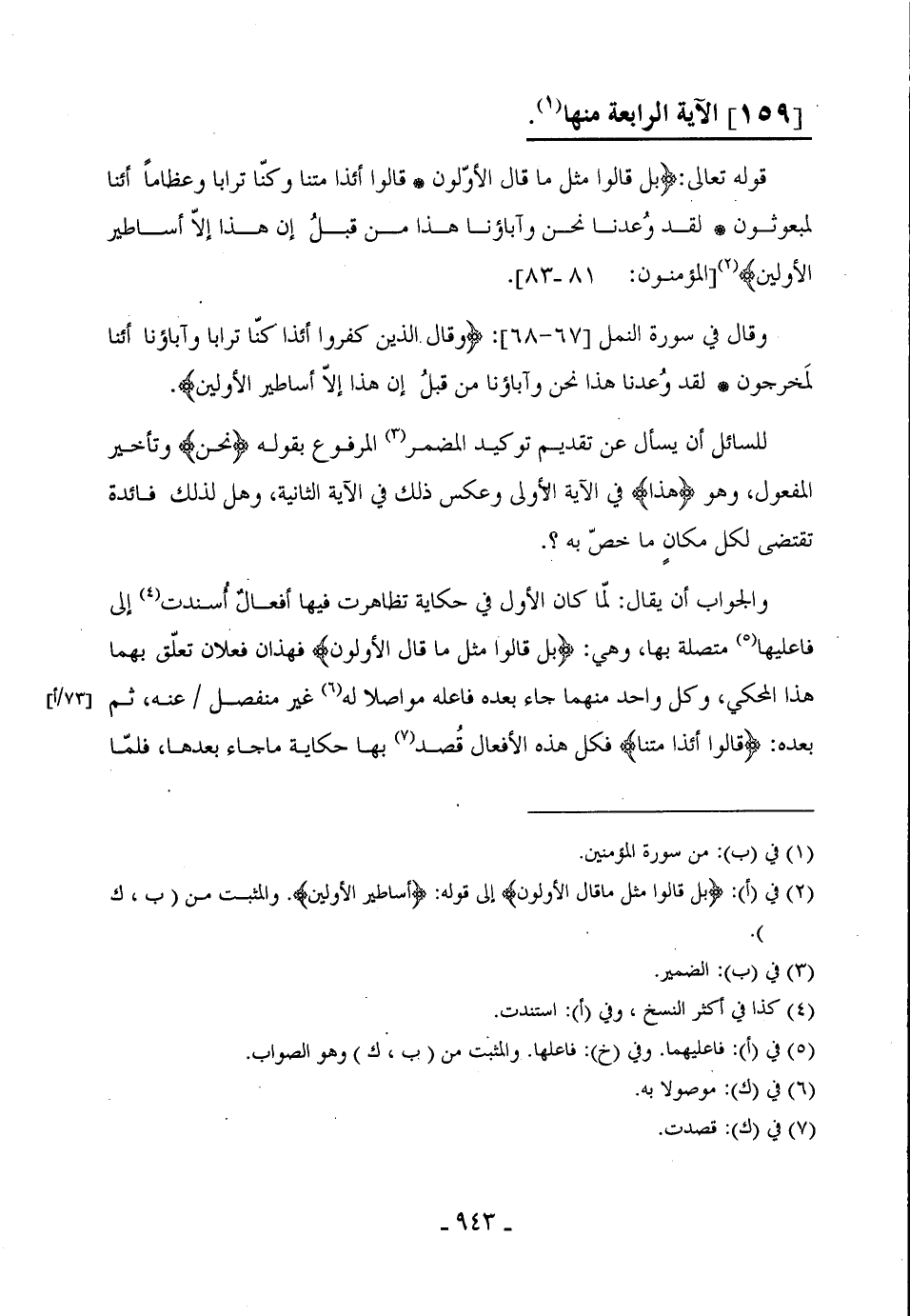 فهذان فعلان تعلّق بهما هذا المحكي، وكل واحد منهما جاء بعده فاعله مواصلا له غير منفصل عنه، ثم بعده: (قَالُوا أَإِذَا مِتْنَا) فكل هذه الأفعال قُصد بها حكاية ما جاء بعدها، فلمّا