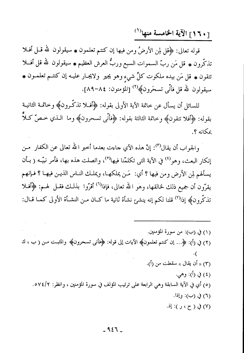 قوله تعالى: (قُلْ لِمَنِ الْأَرْضُ وَمَنْ فِيهَا إِنْ كُنْتُمْ تَعْلَمُونَ (84) سَيَقُولُونَ لِلَّهِ قُلْ أَفَلَا تَذَكَّرُونَ (85) قُلْ مَنْ رَبُّ السَّمَاوَاتِ السَّبْعِ وَرَبُّ الْعَرْشِ الْعَظِيمِ (86) سَيَقُولُونَ لِلَّهِ قُلْ أَفَلَا تَتَّقُونَ (87) قُلْ مَنْ بِيَدِهِ مَلَكُوتُ كُلِّ شَيْءٍ وَهُوَ يُجِيرُ وَلَا يُجَارُ عَلَيْهِ إِنْ كُنْتُمْ تَعْلَمُونَ (88) سَيَقُولُونَ لِلَّهِ قُلْ فَأَنَّى تُسْحَرُونَ (89)