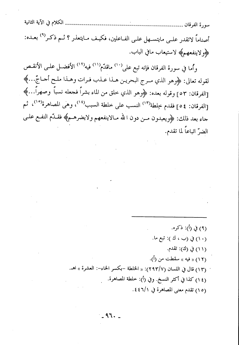 وأما في سورة الفرقان فإنه تبع على ما قدّم فيه الأفضل على الأنقص لقوله تعالى: (وَهُوَ الَّذِي مَرَجَ الْبَحْرَيْنِ هَذَا عَذْبٌ فُرَاتٌ وَهَذَا مِلْحٌ أُجَاجٌ ... ) ، وقوله بعده: وَهُوَ الَّذِي خَلَقَ مِنَ الْمَاءِ بَشَرًا فَجَعَلَهُ نَسَبًا وَصِهْرًا ... ) ، فقدم خِلطة النسب على خلطة السبب، وهى المصاهرة، ثم جاء بعد ذلك: (وَيَعْبُدُونَ مِنْ دُونِ اللَّهِ مَا لَا يَنْفَعُهُمْ وَلَا يَضُرُّهُمْ) فقدّم النفع على الضرّ اتباعاً لما تقدم.