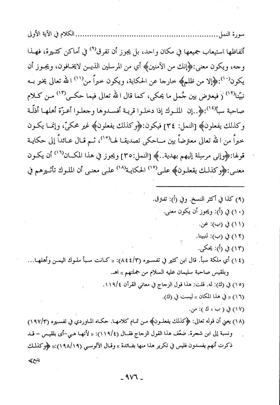 ألفاظها استيعاب جميعها في مكان واحد، بل يجوز أن تفرق في أماكن كثيرة، فهذا وجه، ويكون معنى: (إنك من الآمنين) أي من المرسلين الذين لا يخافون، ويجوز أن يكون: (إلا من ظلم) خارجا عن الحكاية، ويكون خبراً من الله تعالى يخبر به نبيّنا، (فيعترض بين جُمل ما يحكى، كما قال الله تعالى فيما حكى من كلام صاحبة سبأ: (.. إِنَّ الْمُلُوكَ إِذَا دَخَلُوا قَرْيَةً أَفْسَدُوهَا وَجَعَلُوا أَعِزَّةَ أَهْلِهَا أَذِلَّةً وَكَذَلِكَ يَفْعَلُونَ (34)) ، فيكون: (وكذلك يفعلون) غير محكىّ، وإنما يكون خبراً من الله تعالى معترضاً بين ما حكى تصديقا لها، ثم قال عائداً إلى حكاية قولها: (وَإِنِّي مُرْسِلَةٌ إِلَيْهِمْ بِهَدِيَّةٍ ... ) ، ويجوز في هذا المكان أن يكون معنى: (وَكَذَلِكَ يَفْعَلُونَ (34)