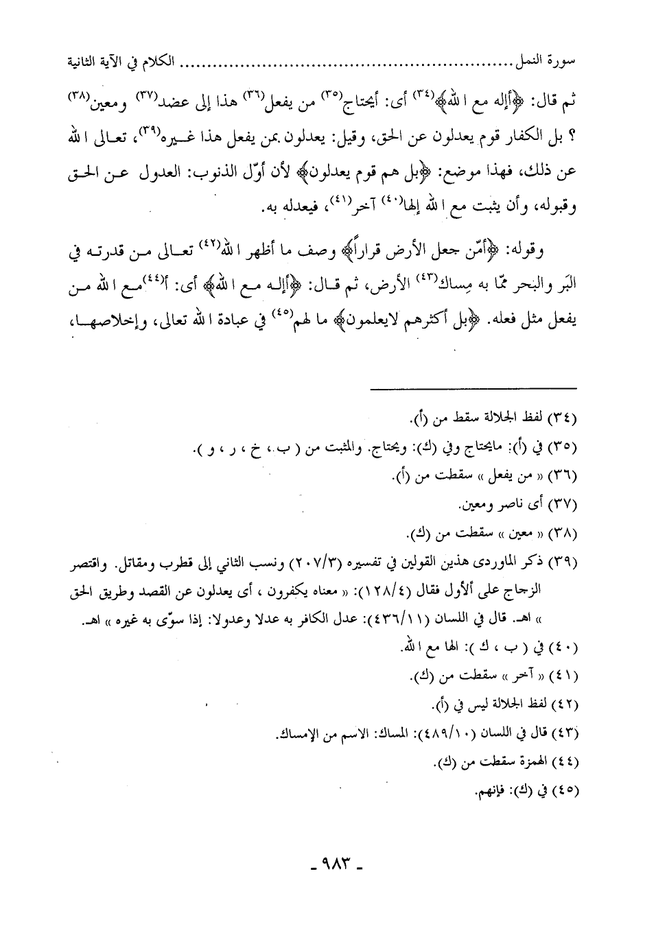 بل الكفار قوم يعدلون عن الحق، وقيل: يعدلون بمن يفعل هذا غيره، تعالى الله عن ذلك، فهذا موضع: (بل هم قوم يعدلون) لأن أوّل الذنوب: العدول عن الحق وقبوله، وأن يثبت مع الله إلها آخر، فيعدله به.