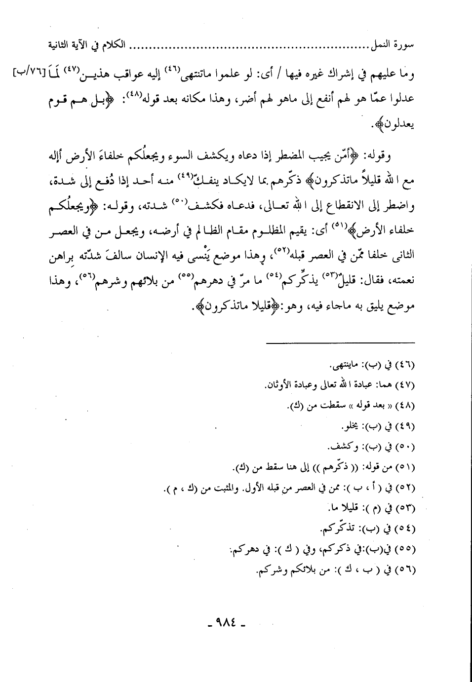 ذكّرهم بما لا يكاد ينفك منه أحد إذا دُفع إلى شدة، واضطر إلى الانقطاع إلى الله تعالى، فدعاه فكشف شدته، وقوله: (وَيَجْعَلُكُمْ خُلَفَاءَ الْأَرْضِ) أى: يقيم المظلوم مقام الظالم في أرضه، ويجعل من في العصر الثانى خلفا ممّن في العصر قبله، وهذا موضع يَنْسى فيه الإنسان سالفَ شدّته بِراهن نعمته، فقال: قليلٌ يذكِّركم ما مرّ في دهرهم من بلائهم وشرهم، وهذا موضع يليق به ما جاء فيه، وهو: (قَلِيلًا مَا تَذَكَّرُونَ (62) .