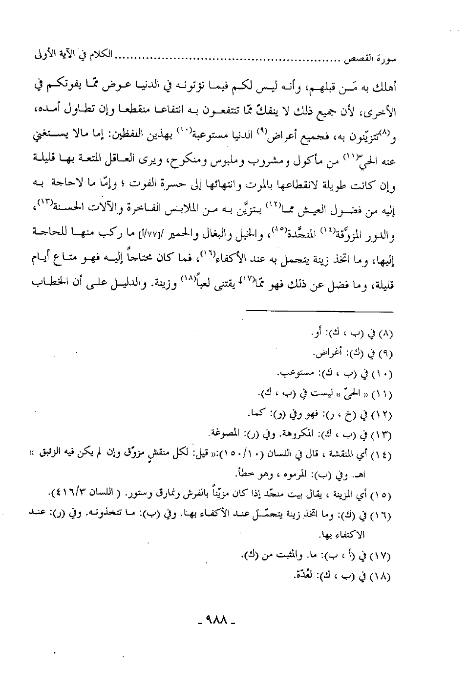 أهلك به مَن قبلهم، وأنه ليس لكم فيما تؤتونه في الدنيا عوض ممّا يفوتكم في الأخرى لأن جميع ذلك لا ينفكّ ممّا تنتفعون به انتفاعا منقطعا وإن تطاول أمده، وتتزيّنون به، فجميع أعراض الدنيا مستوعبة بهذين اللفظين: إما مالا يستغني عنه الحى من مأكول ومشروب وملبوس ومنكوح، ويرى العاقل المتعة بها قليلة وإن كانت طويلة لانقطاعها بالموت وإنهائها إلى حسرة الموت؟ وإمّا ما لاحاجة به إليه من فضول العيش مما يتزيَّن به من الملابس الفاخرة والآلات الحسنة، والدور المزوَّقة المنجَّدة، والخيل والبغال والحمير ما ركب منها للحاجة إليها، وما اتخذ زينة يتجمل به عند الأكفاء، فما كان محتاحاً إليه فهو متاع أيام قليلة، وما فضل عن ذلك فهو ممّا يقتنى لعبا وزينة. والدليل على أن الخطاب